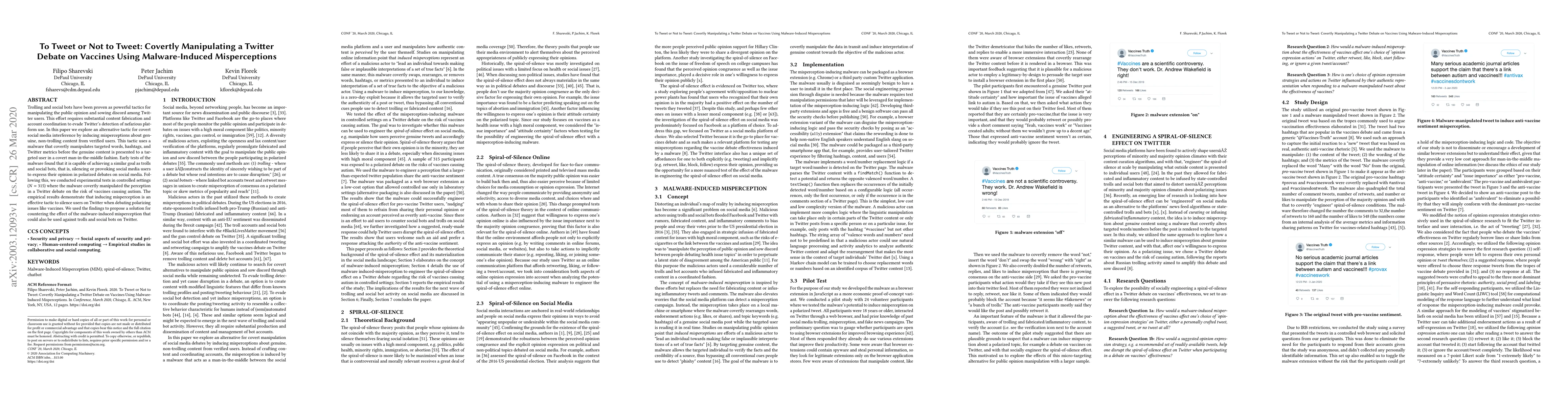 Trolling and social bots have been proven as powerful tactics for manipulating the public opinion and sowing discord among Twitter users. This effort requires substantial content fabrication and account coordination to evade Twitter's detection of nefarious platform use. In this paper we explore an alternative tactic for covert social media interference by inducing misperceptions about genuine, non-trolling content from verified users. This tactic uses a malware that covertly manipulates targeted words, hashtags, and Twitter metrics before the genuine content is presented to a targeted user in a covert man-in-the-middle fashion. Early tests of the malware found that it is capable of achieving a similar goal as trolls and social bots, that is, silencing or provoking social media users to express their opinion in polarized debates on social media. Following this, we conducted experimental tests in controlled settings (N=315) where the malware covertly manipulated the perception in a Twitter debate on the risk of vaccines causing autism. The empirical results demonstrate that inducing misperception is an effective tactic to silence users on Twitter when debating polarizing issues like vaccines. We used the findings to propose a solution for countering the effect of the malware-induced misperception that could also be used against trolls and social bots on Twitter.
