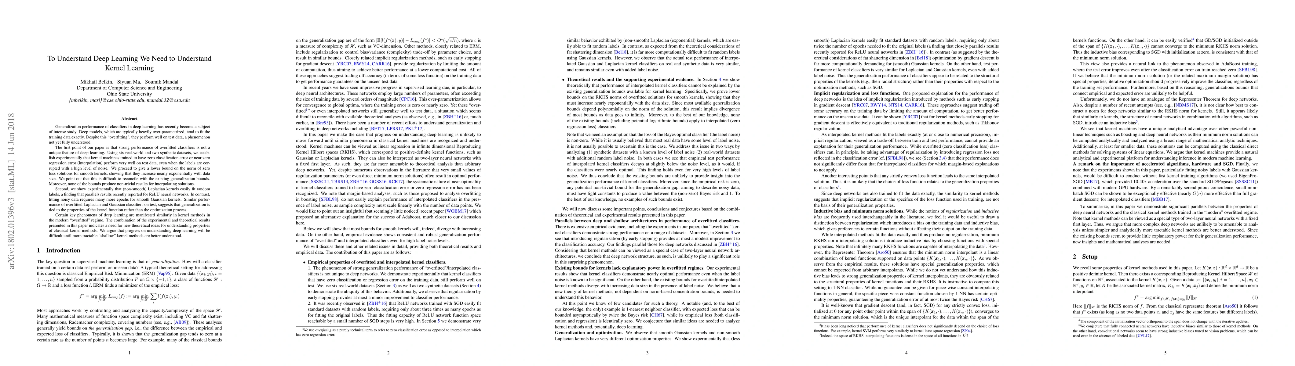 Generalization performance of classifiers in deep learning has recently become a subject of intense study. Deep models, typically over-parametrized, tend to fit the training data exactly. Despite this "overfitting", they perform well on test data, a phenomenon not yet fully understood. The first point of our paper is that strong performance of overfitted classifiers is not a unique feature of deep learning. Using six real-world and two synthetic datasets, we establish experimentally that kernel machines trained to have zero classification or near zero regression error perform very well on test data, even when the labels are corrupted with a high level of noise. We proceed to give a lower bound on the norm of zero loss solutions for smooth kernels, showing that they increase nearly exponentially with data size. We point out that this is difficult to reconcile with the existing generalization bounds. Moreover, none of the bounds produce non-trivial results for interpolating solutions. Second, we show experimentally that (non-smooth) Laplacian kernels easily fit random labels, a finding that parallels results for ReLU neural networks. In contrast, fitting noisy data requires many more epochs for smooth Gaussian kernels. Similar performance of overfitted Laplacian and Gaussian classifiers on test, suggests that generalization is tied to the properties of the kernel function rather than the optimization process. Certain key phenomena of deep learning are manifested similarly in kernel methods in the modern "overfitted" regime. The combination of the experimental and theoretical results presented in this paper indicates a need for new theoretical ideas for understanding properties of classical kernel methods. We argue that progress on understanding deep learning will be difficult until more tractable "shallow" kernel methods are better understood.