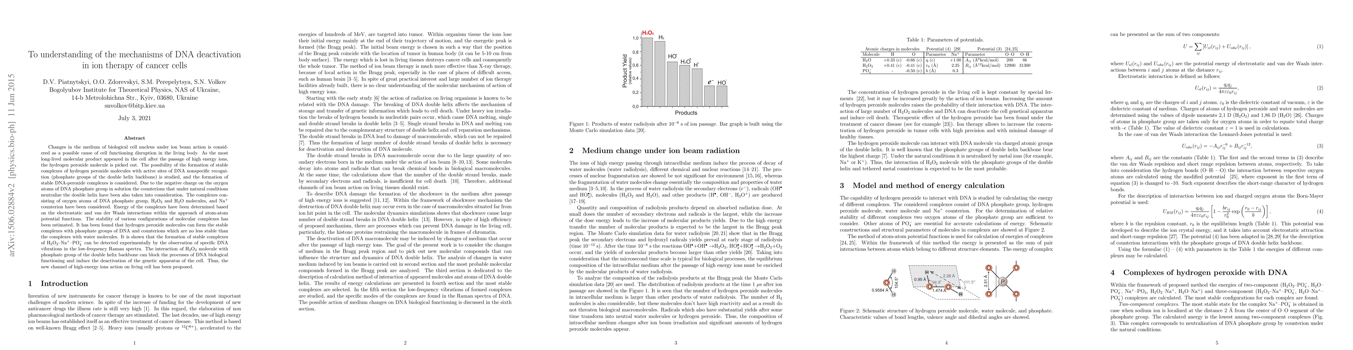 This paper explores the mechanisms by which hydrogen peroxide molecules interact with DNA phosphate groups and counterions, forming stable complexes that disrupt DNA functionality. The study suggests a new pathway for high-energy ion therapy in cancer treatment by inducing DNA deactivation through these interactions.