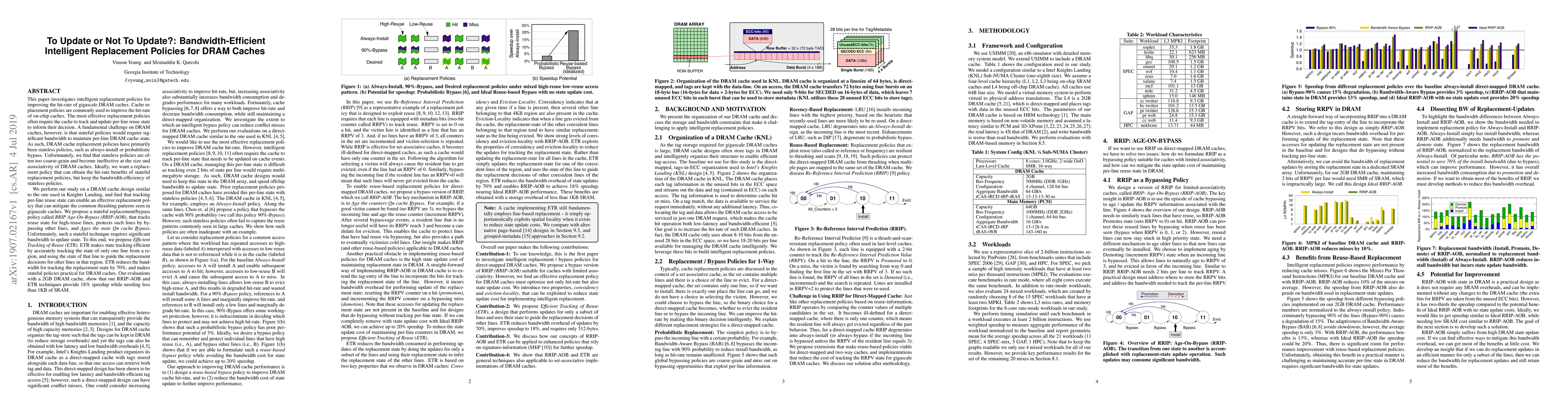 This paper proposes intelligent replacement policies to enhance the hit-rate of large DRAM caches while maintaining bandwidth efficiency. The authors introduce RRIP-AOB, a stateful replacement policy, and ETR, an efficient tracking method that reduces bandwidth usage by 70%, achieving an 18% speedup with minimal SRAM usage.