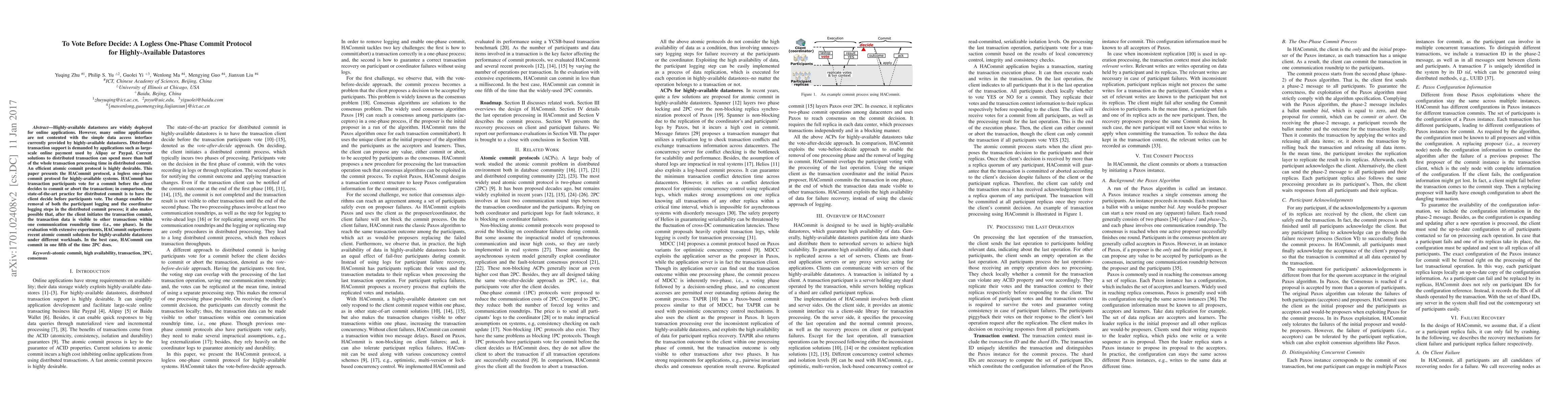 This paper introduces HACommit, a logless one-phase commit protocol for highly-available datastores that allows transaction participants to vote before the client decides to commit or abort, significantly reducing commit time compared to traditional two-phase commit methods. HACommit eliminates participant and coordinator logging, achieving faster transaction visibility.