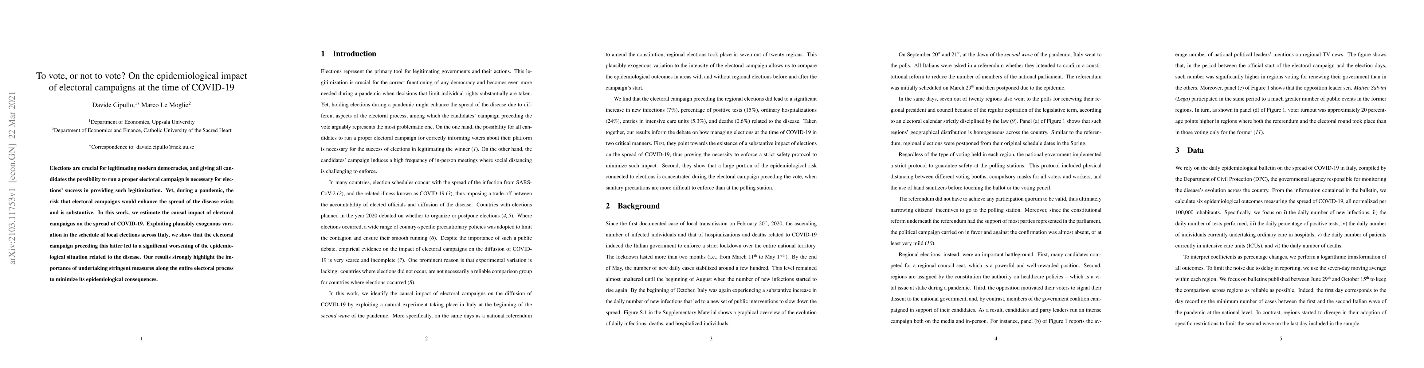 Elections are crucial for legitimating modern democracies, and giving all candidates the possibility to run a proper electoral campaign is necessary for elections' success in providing such legitimization. Yet, during a pandemic, the risk that electoral campaigns would enhance the spread of the disease exists and is substantive. In this work, we estimate the causal impact of electoral campaigns on the spread of COVID-19. Exploiting plausibly exogenous variation in the schedule of local elections across Italy, we show that the electoral campaign preceding this latter led to a significant worsening of the epidemiological situation related to the disease. Our results strongly highlight the importance of undertaking stringent measures along the entire electoral process to minimize its epidemiological consequences.
