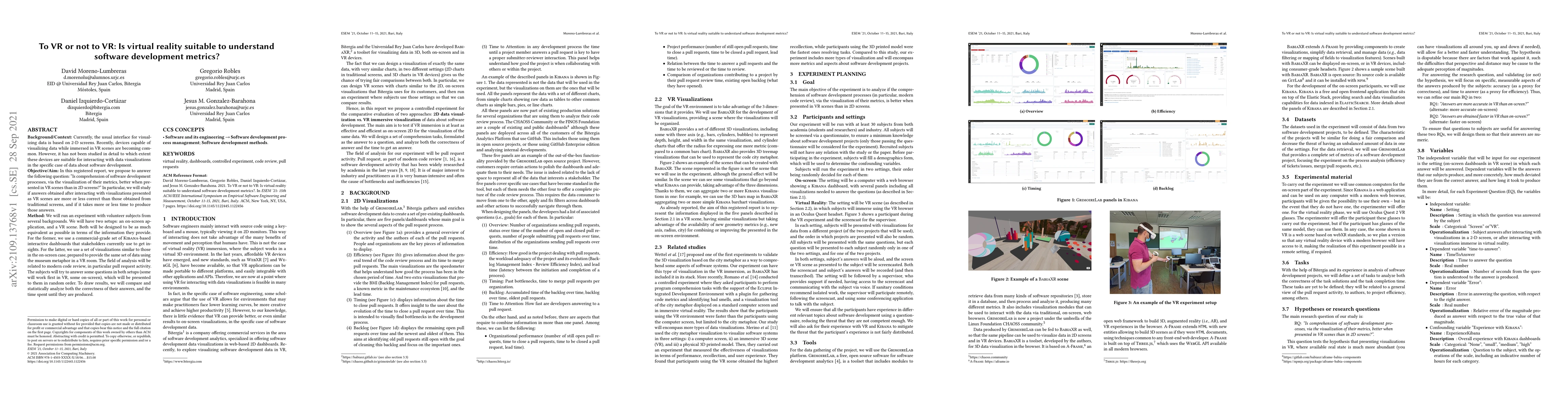 Background/Context: Currently, the usual interface for visualizing data is based on 2-D screens. Recently, devices capable of visualizing data while immersed in VR scenes are becoming common. However, it has not been studied in detail to which extent these devices are suitable for interacting with data visualizations in the specific case of data about software development. Objective/Aim: In this registered report, we propose to answer the following question: "Is comprehension of software development processes, via the visualization of their metrics, better when presented in VR scenes than in 2D screens?" In particular, we will study if answers obtained after interacting with visualizations presented as VR scenes are more or less correct than those obtained from traditional screens, and if it takes more or less time to produce those answers. Method: We will run an experiment with volunteer subjects from several backgrounds. We will have two setups: an on-screen application, and a VR scene. Both will be designed to be as much equivalent as possible in terms of the information they provide. For the former, we use a commercial-grade set of \kibana-based interactive dashboards that stakeholders currently use to get insights. For the latter, we use a set of visualizations similar to those in the on-screen case, prepared to provide the same set of data using the museum metaphor in a VR room. The field of analysis will be related to modern code review, in particular pull request activity. The subjects will try to answer some questions in both setups (some will work first in VR, some on-screen), which will be presented to them in random order. To draw results, we will compare and statistically analyze both the correctness of their answers, and the time spent until they are produced.