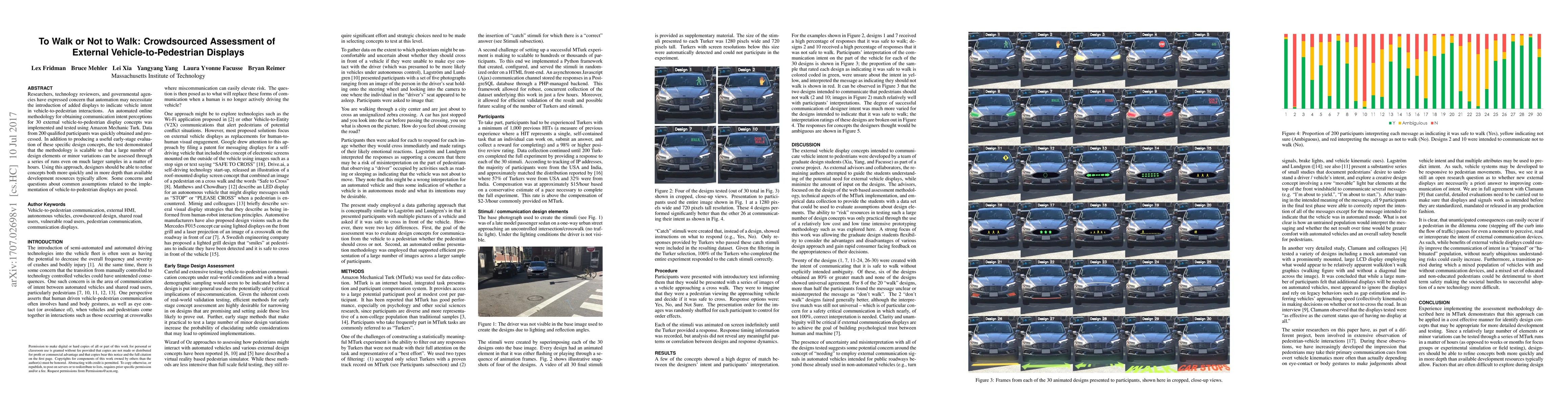 This research used Amazon Mechanic Turk to quickly gather feedback on 30 vehicle-to-pedestrian display concepts from 200 qualified participants. The methodology proved scalable for evaluating numerous design elements, enabling faster and deeper refinement of concepts than traditional methods.