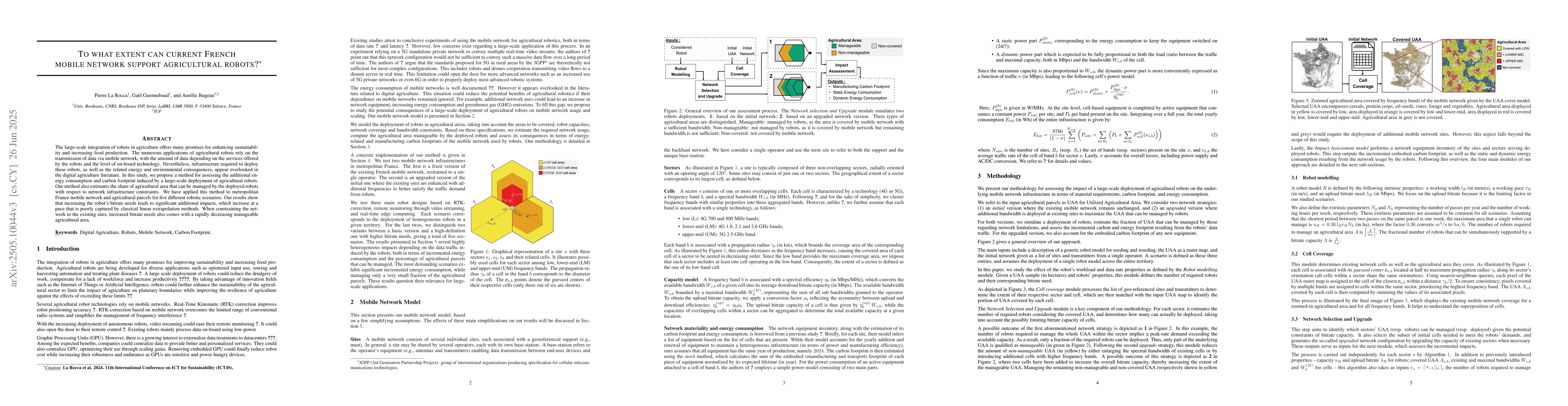 A study assessed the energy consumption and carbon footprint of deploying agricultural robots on French mobile networks, finding that increasing robot bitrate needs significant impacts. The study also found a rapidly decreasing manageable agricultural area when constraining the network to existing sites.