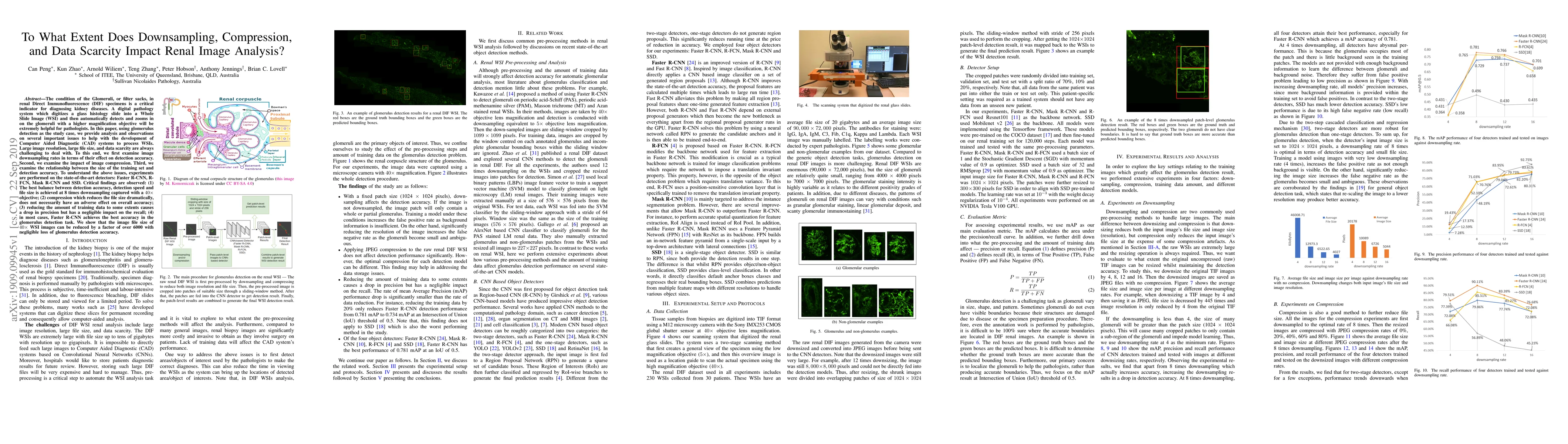 The condition of the Glomeruli, or filter sacks, in renal Direct Immunofluorescence (DIF) specimens is a critical indicator for diagnosing kidney diseases. A digital pathology system which digitizes a glass histology slide into a Whole Slide Image (WSI) and then automatically detects and zooms in on the glomeruli with a higher magnification objective will be extremely helpful for pathologists. In this paper, using glomerulus detection as the study case, we provide analysis and observations on several important issues to help with the development of Computer Aided Diagnostic (CAD) systems to process WSIs. Large image resolution, large file size, and data scarcity are always challenging to deal with. To this end, we first examine image downsampling rates in terms of their effect on detection accuracy. Second, we examine the impact of image compression. Third, we examine the relationship between the size of the training set and detection accuracy. To understand the above issues, experiments are performed on the state-of-the-art detectors: Faster R-CNN, R-FCN, Mask R-CNN and SSD. Critical findings are observed: (1) The best balance between detection accuracy, detection speed and file size is achieved at 8 times downsampling captured with a $40\times$ objective; (2) compression which reduces the file size dramatically, does not necessarily have an adverse effect on overall accuracy; (3) reducing the amount of training data to some extents causes a drop in precision but has a negligible impact on the recall; (4) in most cases, Faster R-CNN achieves the best accuracy in the glomerulus detection task. We show that the image file size of $40\times$ WSI images can be reduced by a factor of over 6000 with negligible loss of glomerulus detection accuracy.
