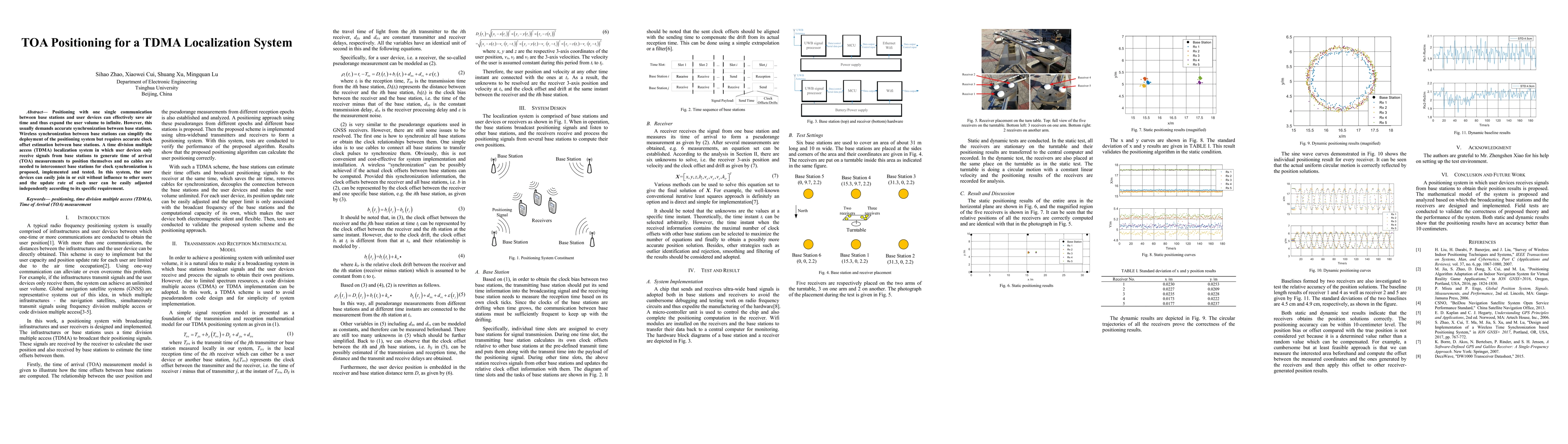 Positioning with one single communication between base stations and user devices can effectively save air time and thus expand the user volume to infinite. However, this usually demands accurate synchronization between base stations. Wireless synchronization between base stations can simplify the deployment of the positioning system but requires accurate clock offset estimation between base stations. A time division multiple access (TDMA) localization system in which user devices only receive signals from base stations to generate time of arrival (TOA) measurements to position themselves and no cables are needed to interconnect base stations for clock synchronization is proposed, implemented and tested. In this system, the user devices can easily join in or exit without influence to other users and the update rate of each user can be easily adjusted independently according to its specific requirement.