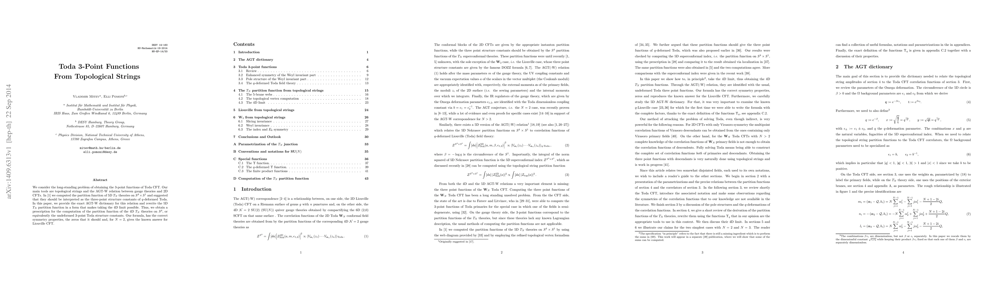 We consider the long-standing problem of obtaining the 3-point functions of Toda CFT. Our main tools are topological strings and the AGT-W relation between gauge theories and 2D CFTs. In arXiv:1310.3841 we computed the partition function of 5D $T_N$ theories on $S^4 \times S^1$ and suggested that they should be interpreted as the three-point structure constants of q-deformed Toda. In this paper, we provide the exact AGT-W dictionary for this relation and rewrite the 5D $T_N$ partition function in a form that makes taking the 4D limit possible. Thus, we obtain a prescription for the computation of the partition function of the 4D $T_N$ theories on $S^4$, or equivalently the undeformed 3-point Toda structure constants. Our formula, has the correct symmetry properties, the zeros that it should and, for $N=2$, gives the known answer for Liouville CFT.