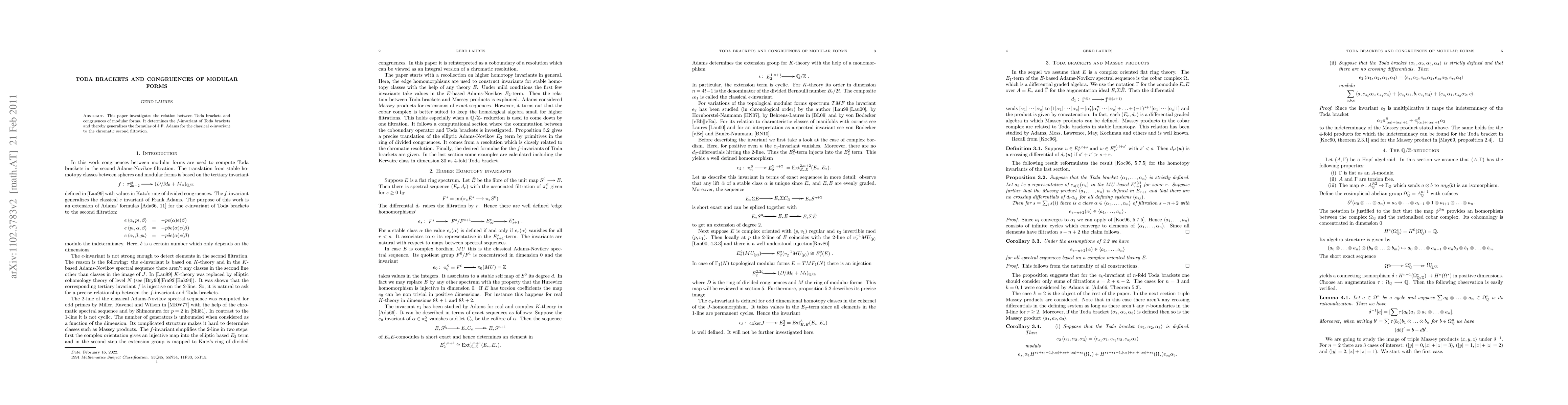 This paper investigates the relation between Toda brackets and congruences of modular forms. It determines the $f$-invariant of Toda brackets and thereby generalizes the formulas of J.F.\ Adams for the classical $e$-invariant to the chromatic second filtration.