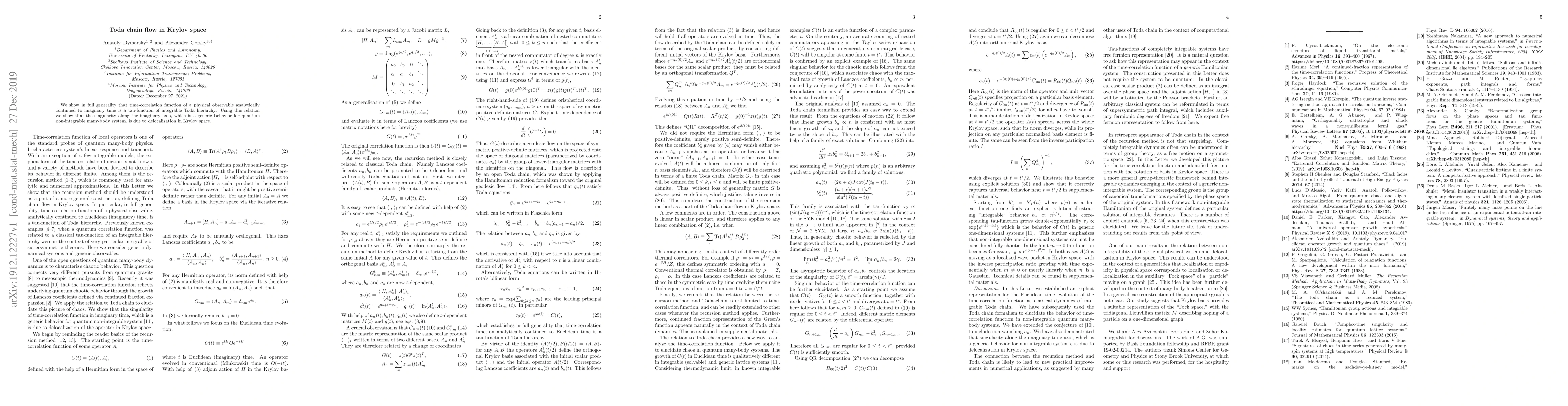 We show in full generality that time-correlation function of a physical observable analytically continued to imaginary time is a tau-function of integrable Toda hierarchy. Using this relation we show that the singularity along the imaginary axis, which is a generic behavior for quantum non-integrable many-body system, is due to delocalization in Krylov space.