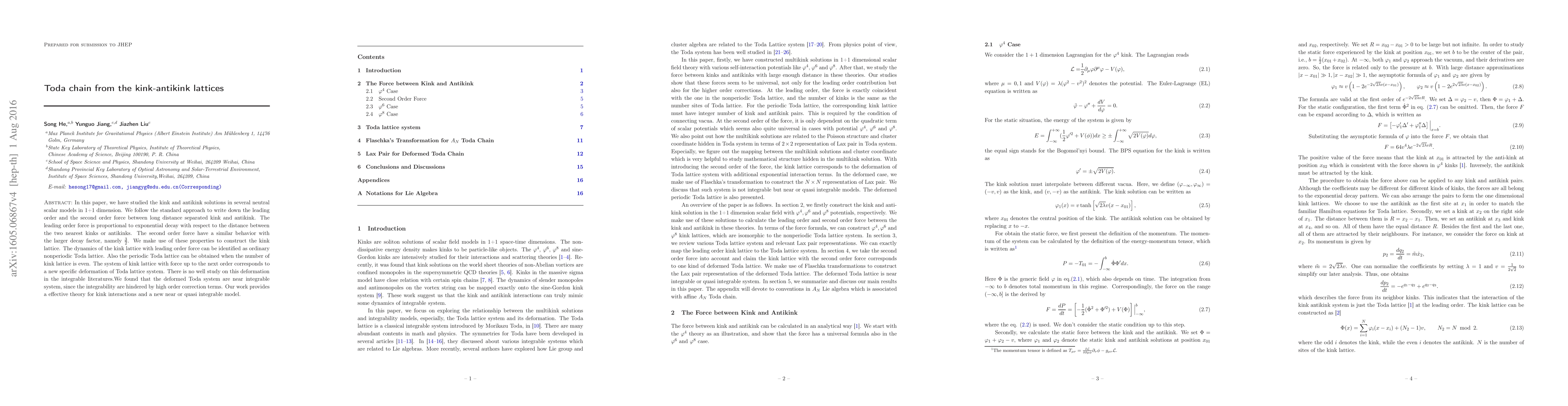 In this paper, we have studied the kink and antikink solutions in several neutral scalar models in 1+1 dimension. We follow the standard approach to write down the leading order and the second order force between long distance separated kink and antikink. The leading order force is proportional to exponential decay with respect to the distance between the two nearest kinks or antikinks. The second order force have a similar behavior with the larger decay factor, namely $3\over 2$. We make use of these properties to construct the kink lattice. The dynamics of the kink lattice with leading order force can be identified as ordinary nonperiodic Toda lattice. Also the periodic Toda lattice can be obtained when the number of kink lattice is even. The system of kink lattice with force up to the next order corresponds to a new specific deformation of Toda lattice system. There is no well study on this deformation in the integrable literatures.We found that the deformed Toda system are near integrable system, since the integrability are hindered by high order correction terms. Our work provides a effective theory for kink interactions and a new near or quasi integrable model.