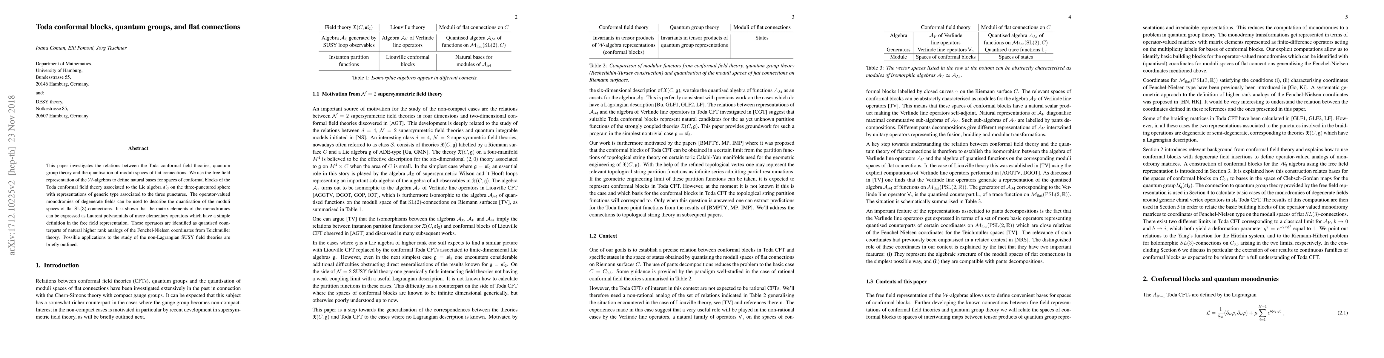 This paper explores the connections between Toda conformal field theories, quantum group theory, and moduli spaces of flat connections, defining natural bases for Toda conformal blocks using $\mathcal{W}$-algebras and linking these to quantised analogues of Fenchel-Nielsen coordinates. The study suggests potential applications to non-Lagrangian supersymmetric field theories.