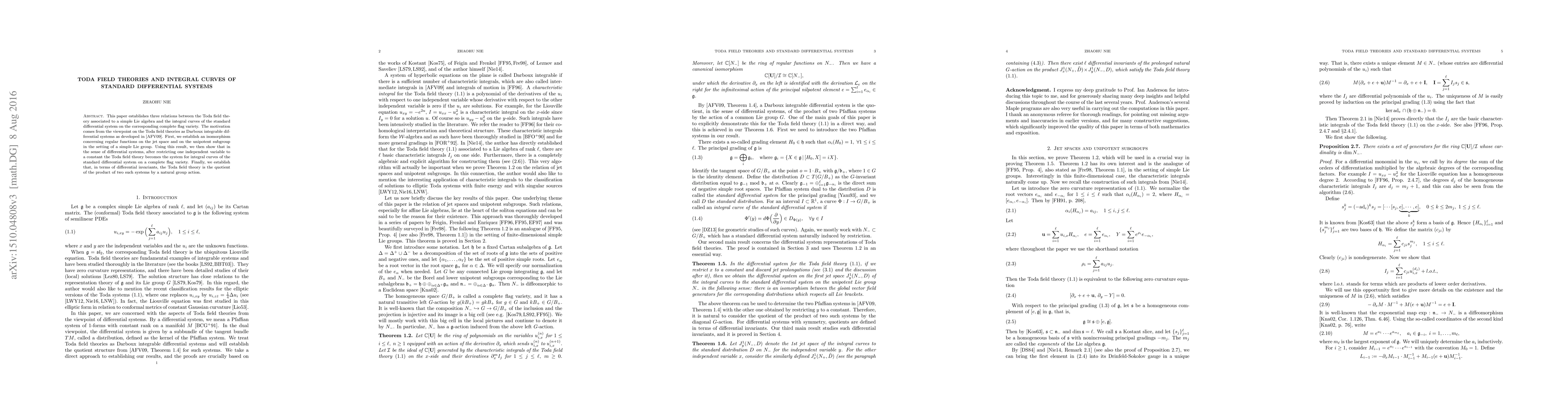 This paper connects Toda field theories to the integral curves of standard differential systems on complete flag varieties, establishing an isomorphism between regular functions on the jet space and unipotent subgroups, and showing that Toda field theory corresponds to these differential systems when restricted to a constant variable.