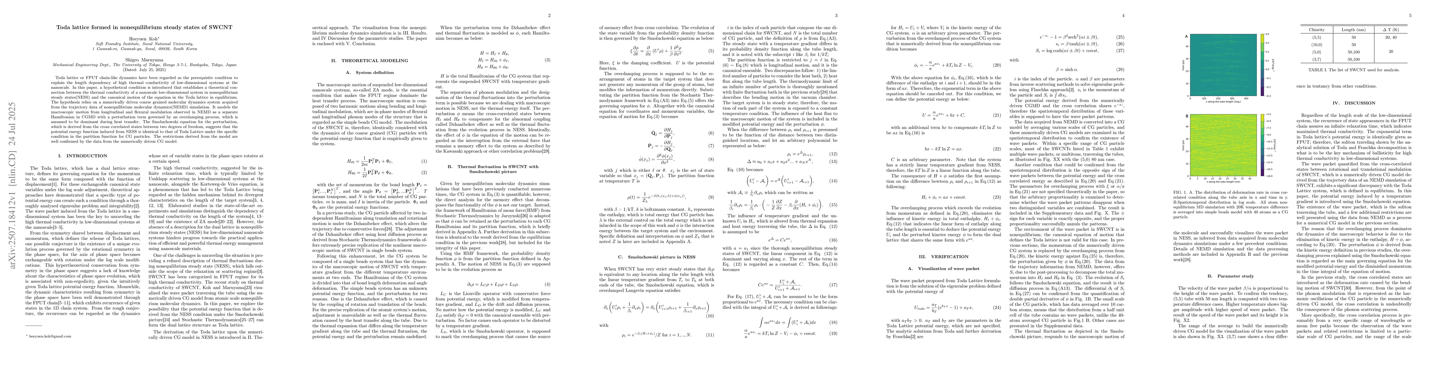 Toda lattice or FPUT chain-like dynamics have been regarded as the prerequisite condition to explain the length dependency of high thermal conductivity of low-dimensional systems at the nanoscale. In this paper, a hypothetical condition is introduced that establishes a theoretical connection between the thermal conductivity of a nanoscale low-dimensional system in nonequilibrium steady states(NESS) and the canonical motion of the equation in the Toda lattice in equilibrium. The hypothesis relies on a numerically driven coarse grained molecular dynamics system acquired from the trajectory data of nonequilibrium molecular dynamics(NEMD) simulation. It models the macroscopic motion from longitudinal and flexural modulation observed in NEMD as a separate Hamiltonian in CGMD with a perturbation term governed by an overdamping process, which is assumed to be dominant during heat transfer. The Smoluchowski equation for the perturbation, which is derived from the cross correlated states between two degrees of freedom, suggests that the potential energy function induced from NESS is identical to that of Toda Lattice under the specific condition in the partition function for CG particles. The restrictions derived from the model are well confirmed by the data from the numerically driven CG model.