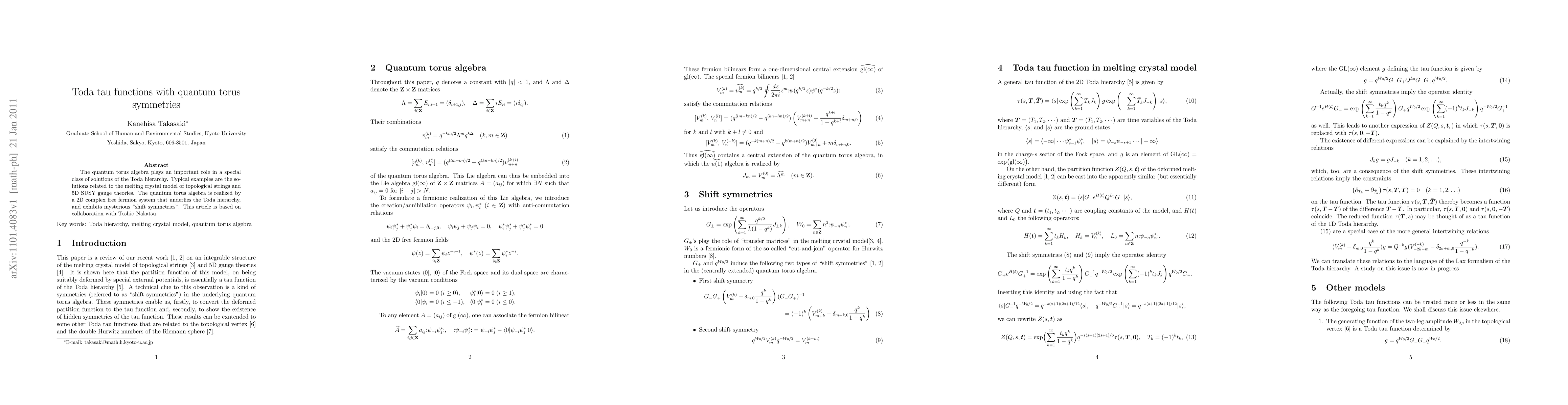 This paper explores the connection between Toda tau functions and quantum torus symmetries, focusing on solutions of the Toda hierarchy related to the melting crystal model and 5D SUSY gauge theories, utilizing a 2D complex free fermion system with "shift symmetries." Collaborative work with Toshiio Nakatsu underpins the findings.