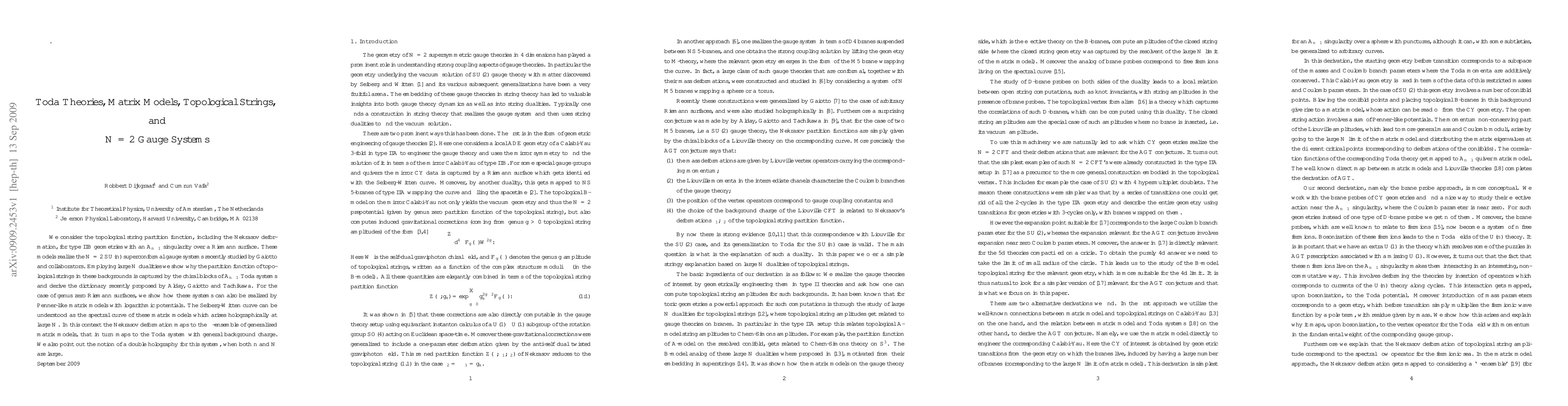 We consider the topological string partition function, including the Nekrasov deformation, for type IIB geometries with an A_{n-1} singularity over a Riemann surface. These models realize the N=2 SU(n) superconformal gauge systems recently studied by Gaiotto and collaborators. Employing large N dualities we show why the partition function of topological strings in these backgrounds is captured by the chiral blocks of A_{n-1} Toda systems and derive the dictionary recently proposed by Alday, Gaiotto and Tachikawa. For the case of genus zero Riemann surfaces, we show how these systems can also be realized by Penner-like matrix models with logarithmic potentials. The Seiberg-Witten curve can be understood as the spectral curve of these matrix models which arises holographically at large N. In this context the Nekrasov deformation maps to the beta-ensemble of generalized matrix models, that in turn maps to the Toda system with general background charge. We also point out the notion of a double holography for this system, when both n and N are large.