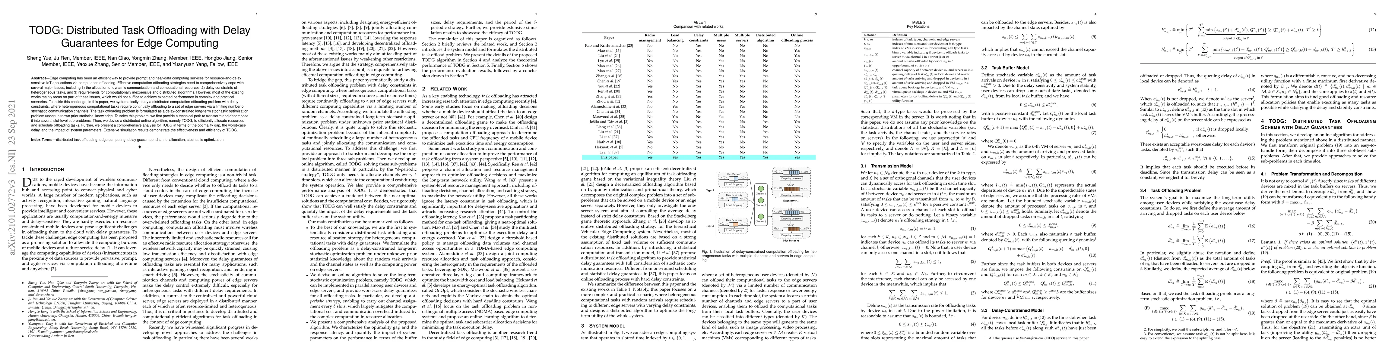 Edge computing has been an efficient way to provide prompt and near-data computing services for resource-and-delay sensitive IoT applications via computation offloading. Effective computation offloading strategies need to comprehensively cope with several major issues, including the allocation of dynamic communication and computational resources, the deadline constraints of heterogeneous tasks, and the requirements for computationally inexpensive and distributed algorithms. However, most of the existing works mainly focus on part of these issues, which would not suffice to achieve expected performance in complex and practical scenarios. To tackle this challenge, in this paper, we systematically study a distributed computation offloading problem with hard delay constraints, where heterogeneous computational tasks require continually offloading to a set of edge servers via a limiting number of stochastic communication channels. The task offloading problem is then cast as a delay-constrained long-term stochastic optimization problem under unknown priori statistical knowledge. To resolve this problem, we first provide a technical path to transform and decompose it into several slot-level subproblems, then we develop a distributed online algorithm, namely TODG, to efficiently allocate the resources and schedule the offloading tasks with delay guarantees. Further, we present a comprehensive analysis for TODG, in terms of the optimality gap, the delay guarantees, and the impact of system parameters. Extensive simulation results demonstrate the effectiveness and efficiency of TODG.