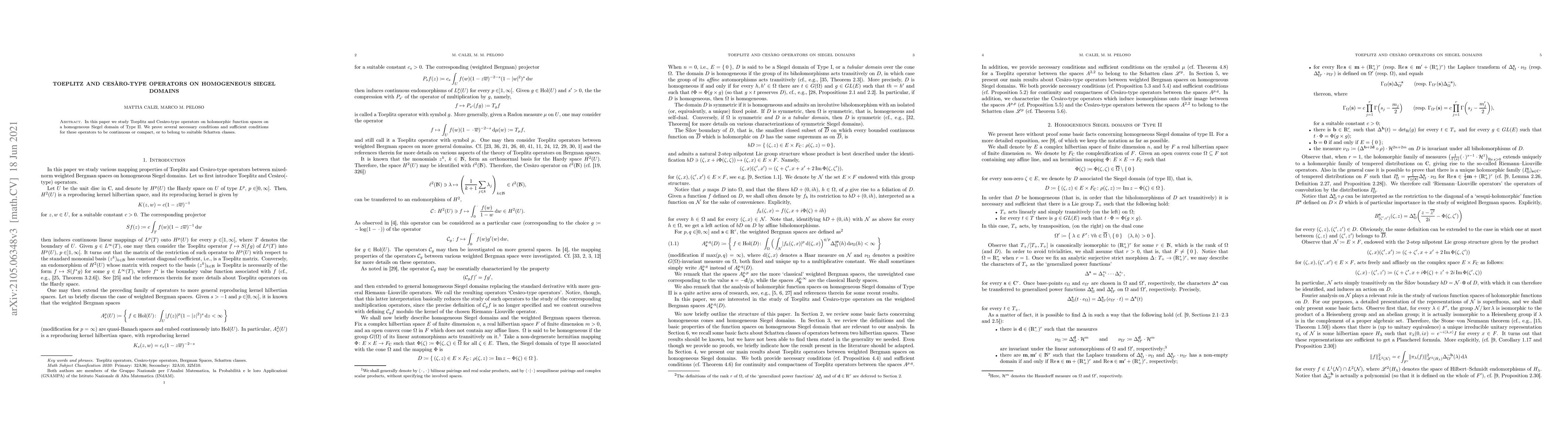 In this paper we study Toeplitz and Ces\`aro-type operators on holomorphic function spaces on a homogeneous Siegel domain of Type II. We prove several necessary conditions and sufficient conditions for these operators to be continuous or compact, or to belong to suitable Schatten classes.