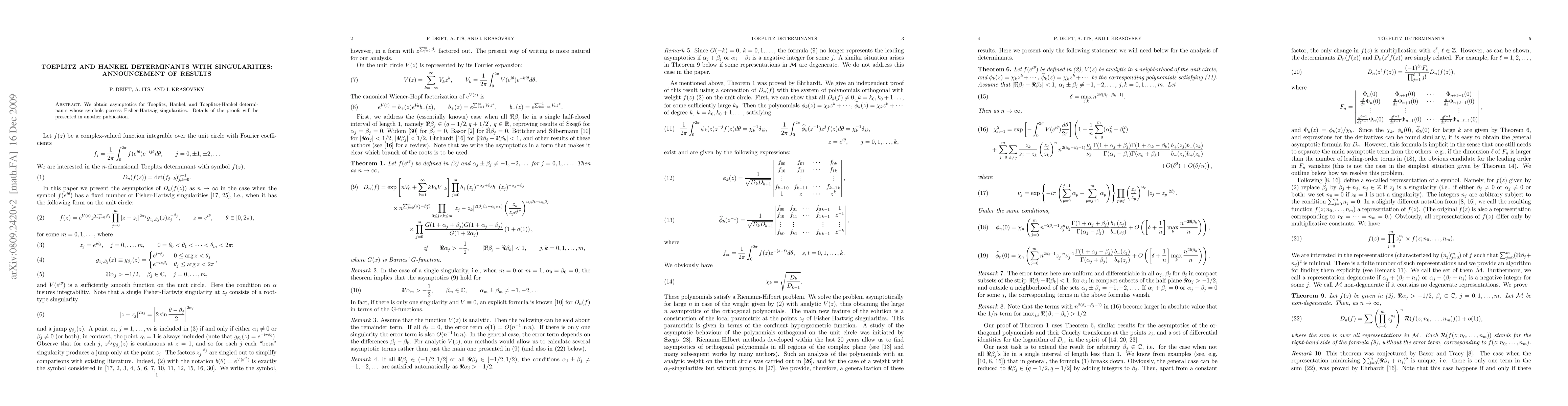 We obtain asymptotics for Toeplitz, Hankel, and Toeplitz+Hankel determinants whose symbols possess Fisher-Hartwig singularities. Details of the proofs will be presented in another publication.