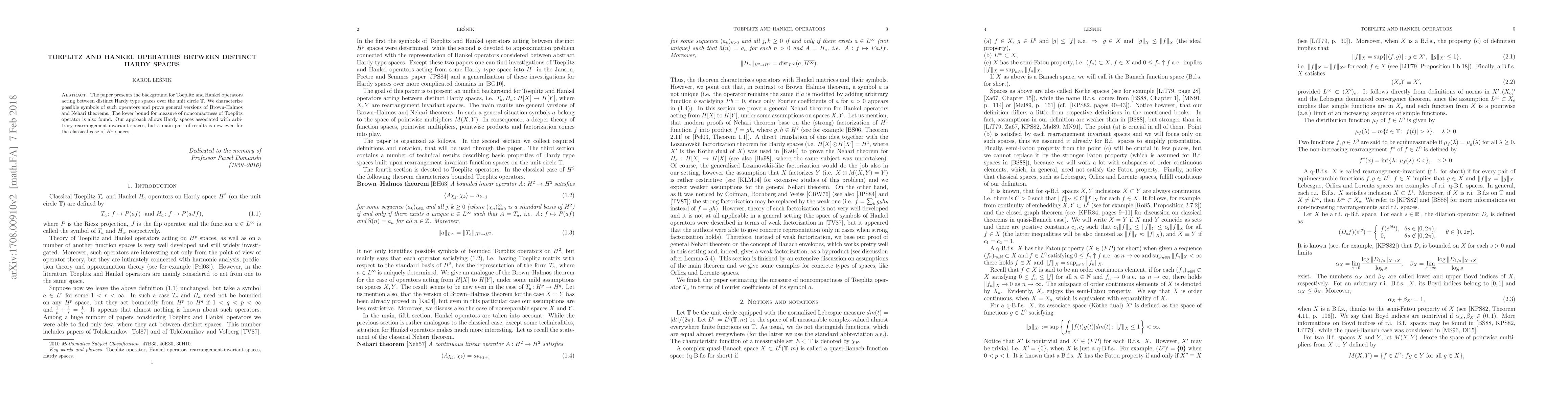 The paper gives the background for Toeplitz $T_a$ and Hankel $H_a$ operators acting between distinct Hardy type spaces over the unit circle $\mathbb{T}$. We characterize possible symbols of such operators and prove general versions of Brown-Halmos and Nehari theorems. The lower bound for measure of noncomactness of Toeplitz operator is also found. Our approach allows Hardy spaces associated with arbitrary rearrangement invariant spaces, but part of the results is new even for the classical case of $H^p$ spaces.