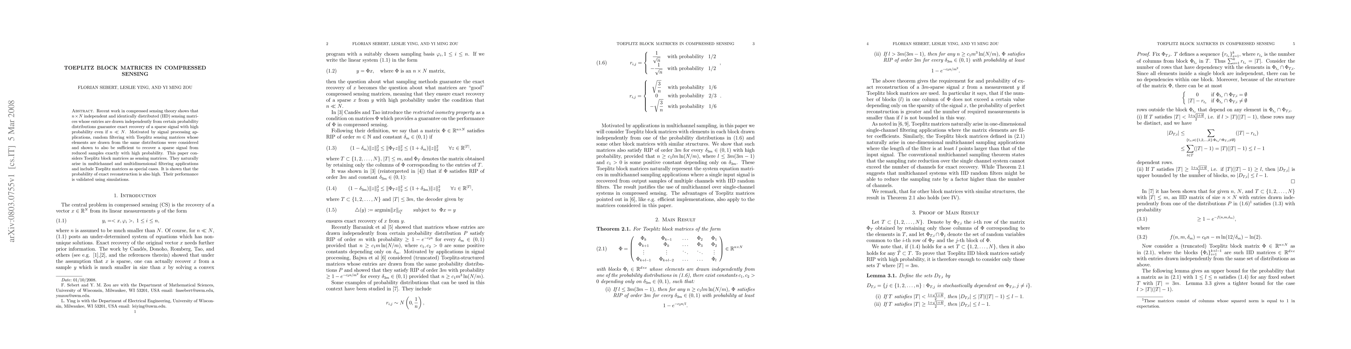 This paper explores the use of Toeplitz block matrices as sensing matrices in compressed sensing, demonstrating their effectiveness in exact recovery of sparse signals from reduced samples. Simulations validate their high probability of exact reconstruction in multichannel and multidimensional filtering applications.
