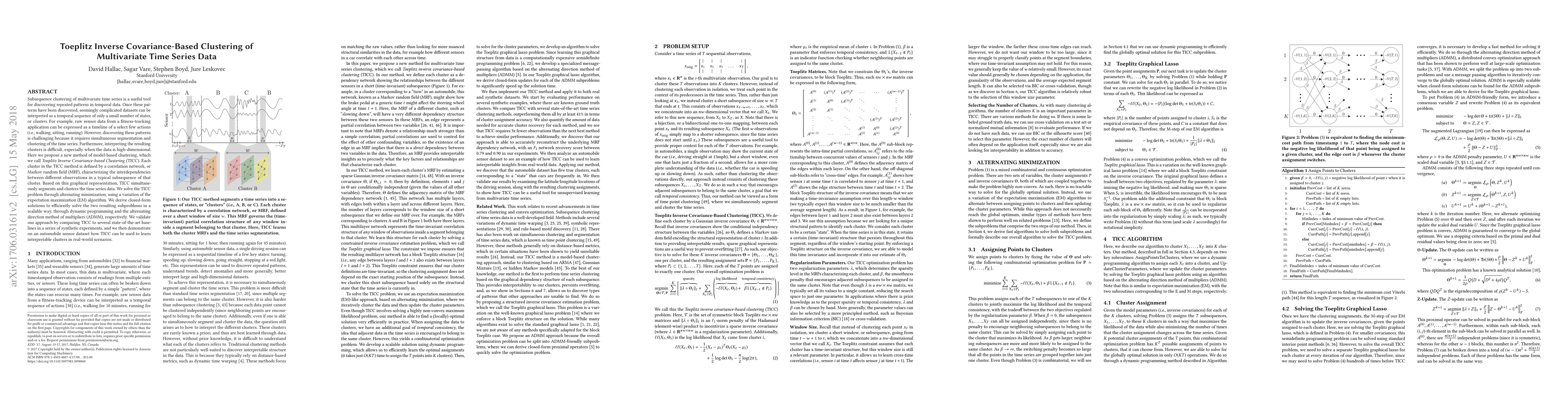 This paper proposes Toeplitz Inverse Covariance-based Clustering (TICC) for subsequence clustering of multivariate time series data, defining clusters via correlation networks and solving the problem using alternating minimization and efficient algorithms. The method is validated against state-of-the-art baselines and demonstrated on an automobile sensor dataset.