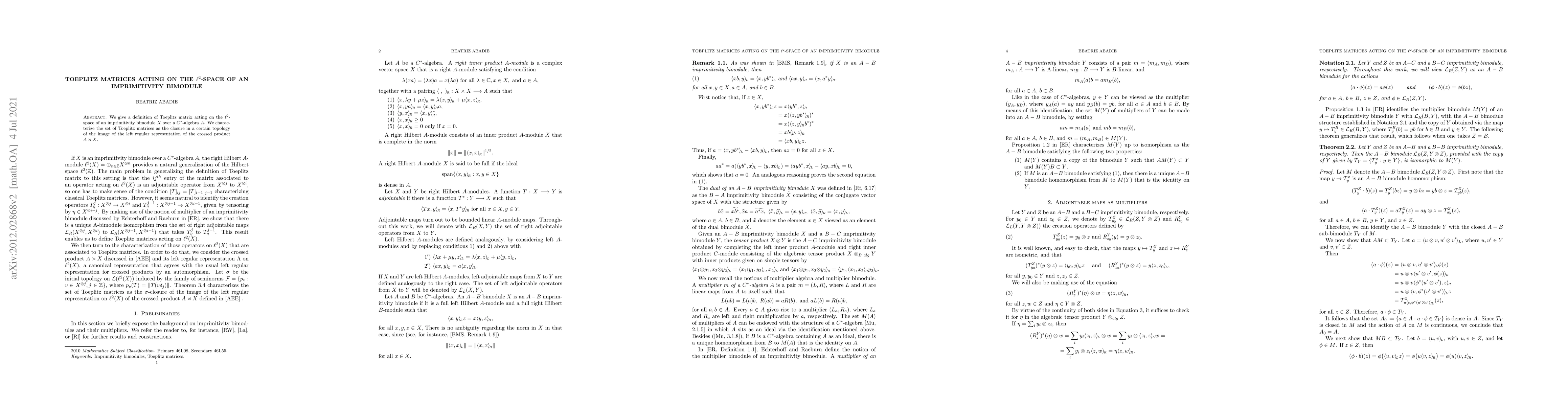Summary: This paper defines Toeplitz matrices acting on the $\ell^2$-space of an imprimitivity bimodule $X$ over a $C^*$-algebra $A$ and characterizes the set of these matrices as the closure of the left regular representation's image in the crossed product $A\rtimes X$.