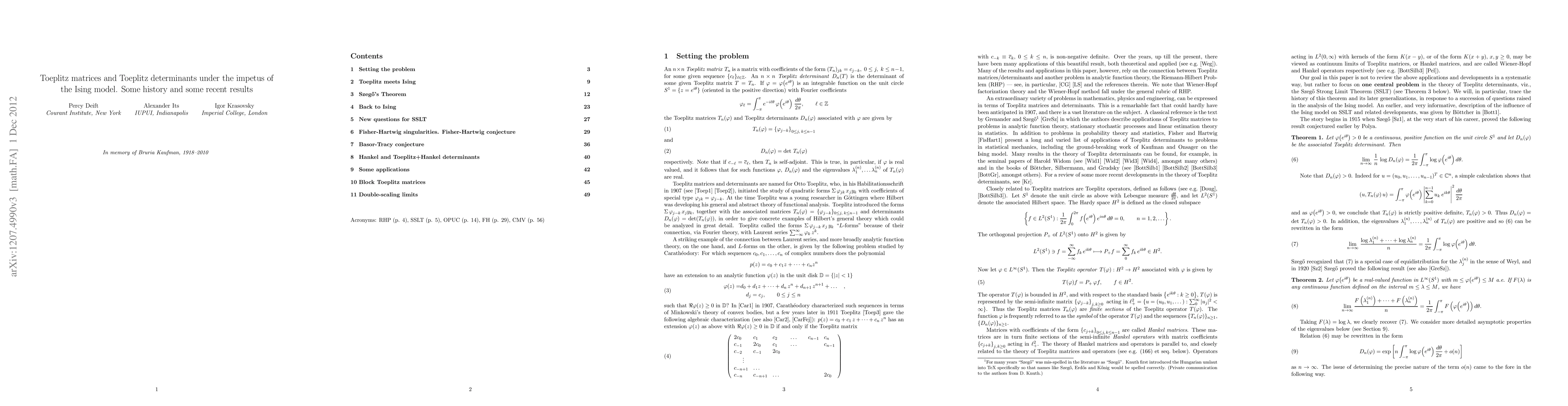 This paper reviews historical and recent developments in Toeplitz determinants, emphasizing their application spurred by the two-dimensional Ising model, which has significantly influenced the theory's growth.