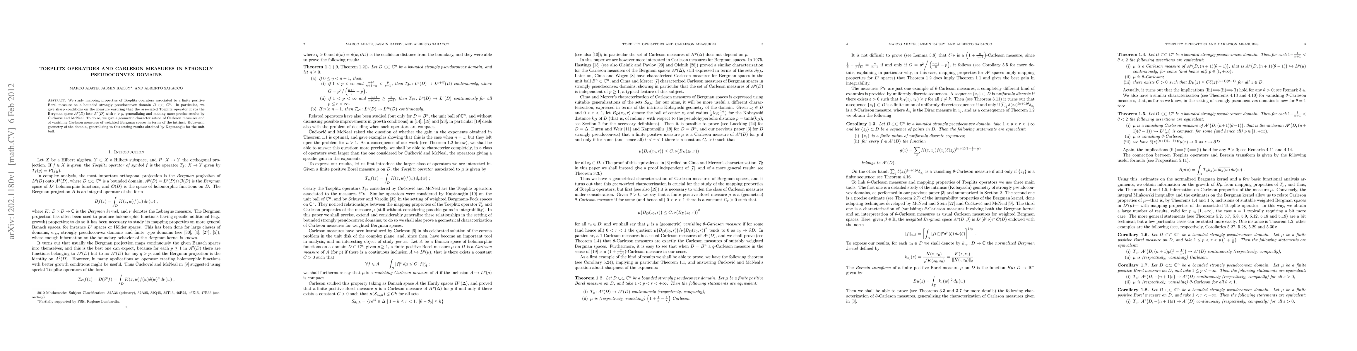 We study mapping properties of Toeplitz operators associated to a finite positive Borel measure on a bounded strongly pseudoconvex domain D in n complex variables. In particular, we give sharp conditions on the measure ensuring that the associated Toeplitz operator maps the Bergman space A^p(D) into A^r(D) with r>p, generalizing and making more precise results by Cuckovic and McNeal. To do so, we give a geometric characterization of Carleson measures and of vanishing Carleson measures of weighted Bergman spaces in terms of the intrinsic Kobayashi geometry of the domain, generalizing to this setting results obtained by Kaptanoglu for the unit ball.