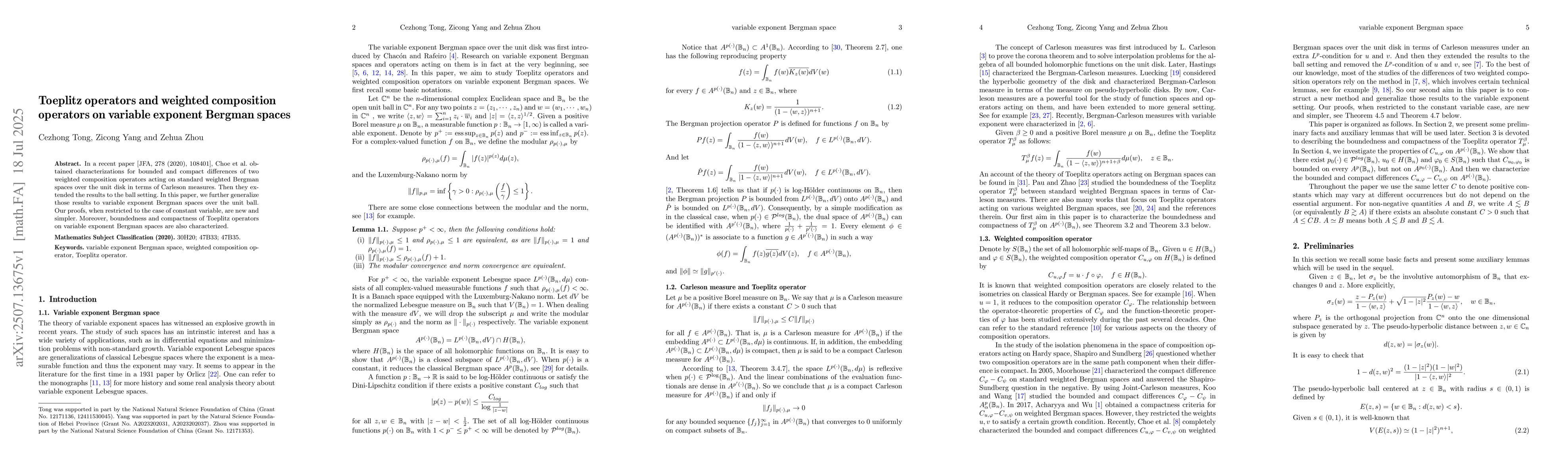 In a recent paper [JFA, 278 (2020), 108401], Choe et al. obtained characterizations for bounded and compact differences of two weighted composition operators acting on standard weighted Bergman spaces over the unit disk in terms of Carleson measures. Then they extended the results to the ball setting. In this paper, we further generalize those results to variable exponent Bergman spaces over the unit ball. Our proofs, when restricted to the case of constant variable, are new and simpler. Moreover, boundedness and compactness of Toeplitz operators on variable exponent Bergman spaces are also characterized.