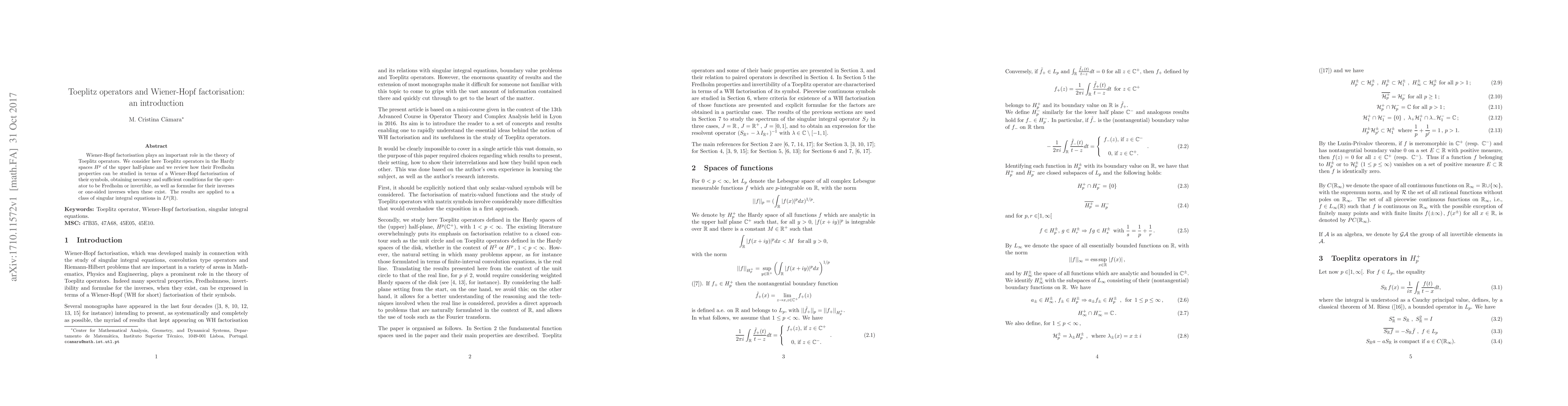 This paper introduces the relationship between Toeplitz operators and Wiener-Hopf factorisation, focusing on the Hardy spaces $H^p$ and deriving necessary and sufficient conditions for Fredholm properties through Wiener-Hopf factorisation of operator symbols. Applications to singular integral equations in $L^p(\mathbb R)$ are also discussed.