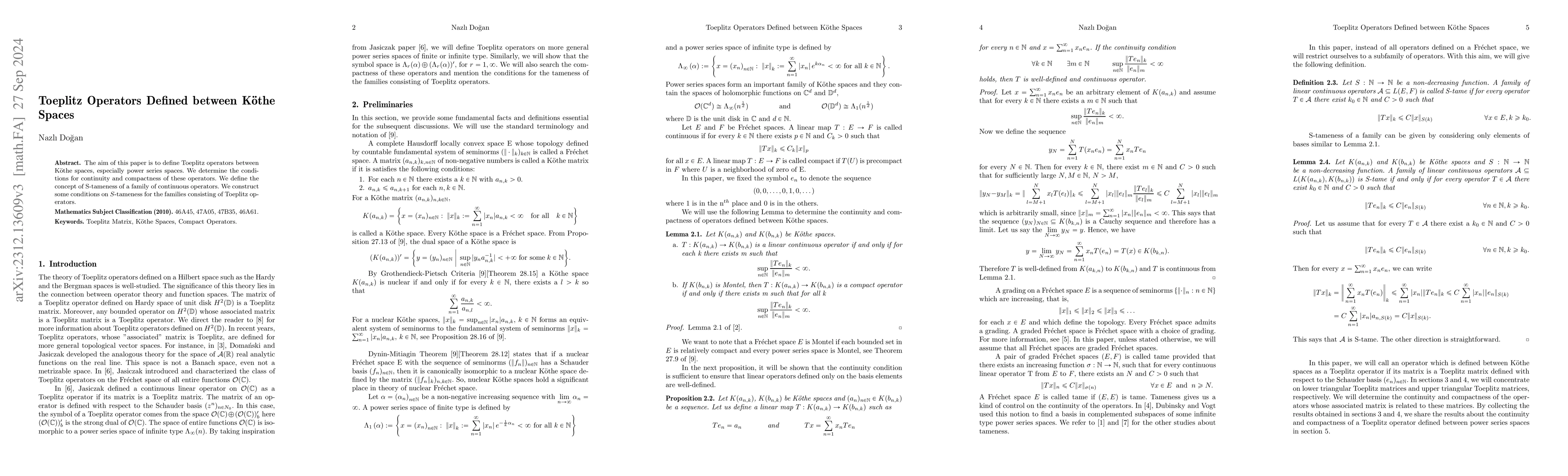 This paper defines Toeplitz operators between Köthe spaces, particularly focusing on power series spaces, and establishes criteria for their continuity and compactness. It also introduces the notion of S-tameness for families of continuous operators and provides conditions for Toeplitz operator families to be S-tame.
