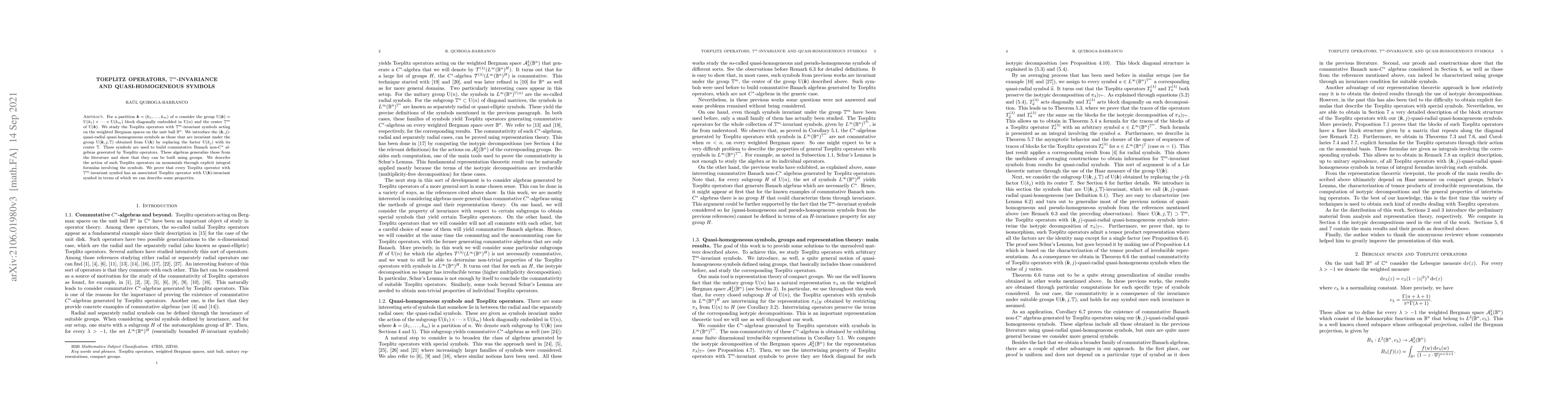 For a partition $\boldsymbol{k} = (k_1, \dots, k_m)$ of $n$ consider the group $\mathrm{U}(\boldsymbol{k}) = \mathrm{U}(k_1) \times \dots \times \mathrm{U}(k_m)$ block diagonally embedded in $\mathrm{U}(n)$ and the center $\mathbb{T}^m$ of $\mathrm{U}(\boldsymbol{k})$. We study the Toeplitz operators with $\mathbb{T}^m$-invariant symbols acting on the weighted Bergman spaces on the unit ball $\mathbb{B}^n$. We introduce the $(\boldsymbol{k},j)$-quasi-radial quasi-homogeneous symbols as those that are invariant under the group $\mathrm{U}(\boldsymbol{k},j,\mathbb{T})$ obtained from $\mathrm{U}(\boldsymbol{k})$ by replacing the factor $\mathrm{U}(k_j)$ with its center $\mathbb{T}$. These symbols are used to build commutative Banach non-$C^*$ algebras generated by Toeplitz operators. These algebras generalize those from the literature and show that they can be built using groups. We describe the action of such Toeplitz operators on monomials through explicit integral formulas involving the symbols. We prove that every Toeplitz operator with $\mathbb{T}^m$-invariant symbol has an associated Toeplitz operator with $\mathrm{U}(\boldsymbol{k})$-invariant symbol in terms of which we can describe some properties.