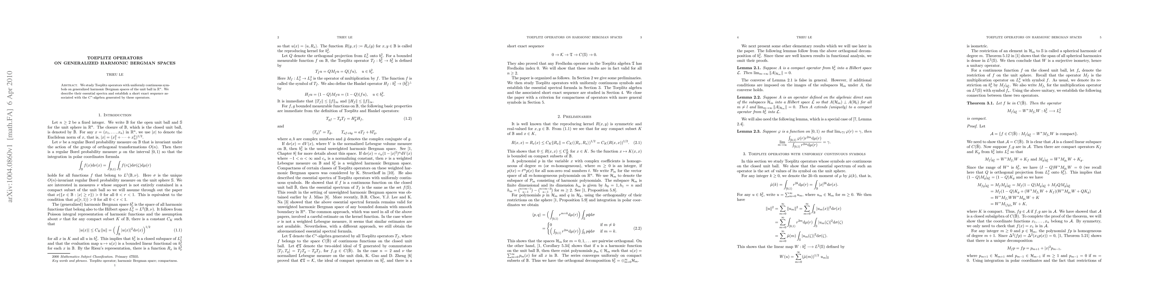 Summary: This paper investigates Toeplitz operators on generalized harmonic Bergman spaces within the unit ball in $\mathbb{R}^n$, focusing on their essential spectra and constructing a short exact sequence linked to the $C^{*}$-algebra they generate.