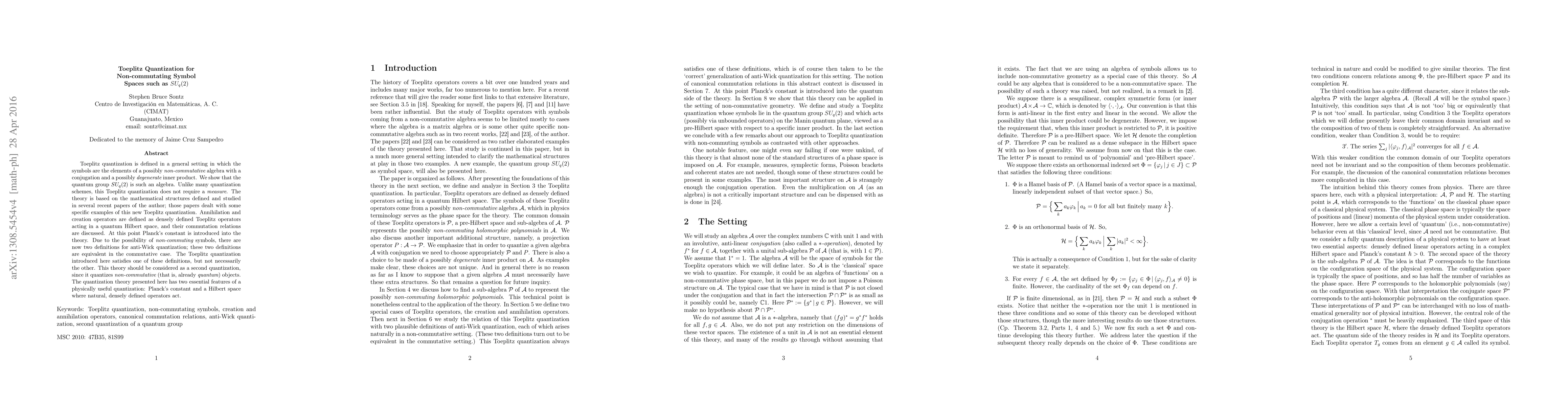 Toeplitz quantization is defined in a general setting in which the symbols are the elements of a possibly non-commutative algebra with a conjugation and a possibly degenerate inner product. We show that the quantum group $SU_q(2)$ is such an algebra. Unlike many quantization schemes, this Toeplitz quantization does not require a measure. The theory is based on the mathematical structures defined and studied in several recent papers of the author; those papers dealt with some specific examples of this new Toeplitz quantization. Annihilation and creation operators are defined as densely defined Toeplitz operators acting in a quantum Hilbert space, and their commutation relations are discussed. At this point Planck's constant is introduced into the theory. Due to the possibility of non-commuting symbols, there are now two definitions for anti-Wick quantization; these two definitions are equivalent in the commutative case. The Toeplitz quantization introduced here satisfies one of these definitions, but not necessarily the other. This theory should be considered as a second quantization, since it quantizes non-commutative (that is, already quantum) objects. The quantization theory presented here has two essential features of a physically useful quantization: Planck's constant and a Hilbert space where natural, densely defined operators act.
