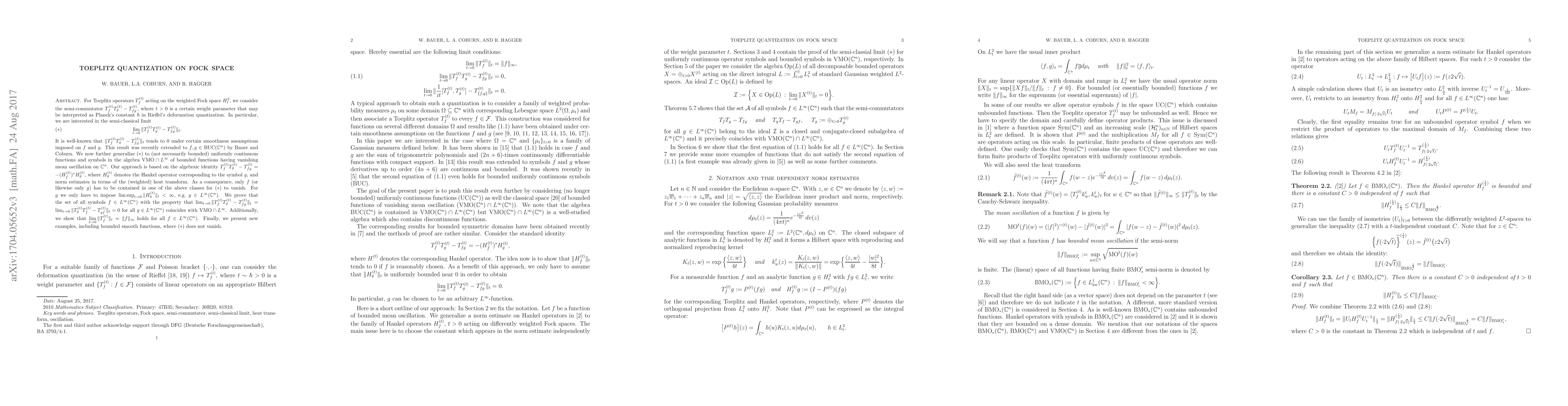 For Toeplitz operators $T_f^{(t)}$ acting on the weighted Fock space $H_t^2$, we consider the semi-commutator $T_f^{(t)}T_g^{(t)}-T_{fg}^{(t)}$, where $t>0$ is a certain weight parameter that may be interpreted as Planck's constant $\hbar$ in Rieffel's deformation quantization. In particular, we are interested in the semi-classical limit \tag{$*$}\lim\limits_{t\to 0}\|T_f^{(t)}T_g^{(t)}-T_{fg}^{(t)}\|_t. It is well-known that $\|T_f^{(t)}T_g^{(t)}-T_{fg}^{(t)}\|_t$ tends to $0$ under certain smoothness assumptions imposed on $f$ and $g$. This result was extended to $f,g \in \mathrm{BUC}(\mathbb{C}^n)$ in a recent paper by Bauer and Coburn. We now further generalize this result to (not necessarily bounded) uniformly continuous functions and symbols in the algebra $\mathrm{VMO} \cap L^{\infty}$ of bounded functions having vanishing mean oscillation on $\mathbb{C}^n$. Our approach is based on the algebraic identity $T_f^{(t)}T_g^{(t)}-T_{fg}^{(t)}=-(H_{\bar{f}}^{(t)})^*H_g^{(t)}$, where $H_g^{(t)}$ denotes the Hankel operator corresponding to the symbol $g$, and norm estimates in terms of the (weighted) heat transform. As a consequence, only $f$ (or likewise only $g$) has to be contained in one of the above classes for $(*)$ to vanish. For $g$ we only have to impose $\limsup_{t \to 0}\|H_g^{(t)}\|_t<\infty$, e.g. $g \in L^{\infty}(\mathbb{C}^n)$. We prove that the set of all symbols $f\in L^{\infty}(\mathbb{C}^n)$ with the property that $\lim_{t \rightarrow 0}\|T^{(t)}_fT^{(t)}_g-T^{(t)}_{fg}\|_t=\lim_{t\to 0}\|T_g^{(t)}T_f^{(t)}-T_{gf}^{(t)}\|_t=0$ for all $g\in L^{\infty}(\mathbb{C}^n)$ coincides with $\mathrm{VMO}\cap L^{\infty}$. Additionally, we show that $\lim_{t\to 0}\|T_f^{(t)}\|_t=\|f\|_{\infty}$ holds for all $f\in L^{\infty}(\mathbb{C}^n)$. Finally, we present new examples, including bounded smooth functions, where $(*)$ does not vanish.