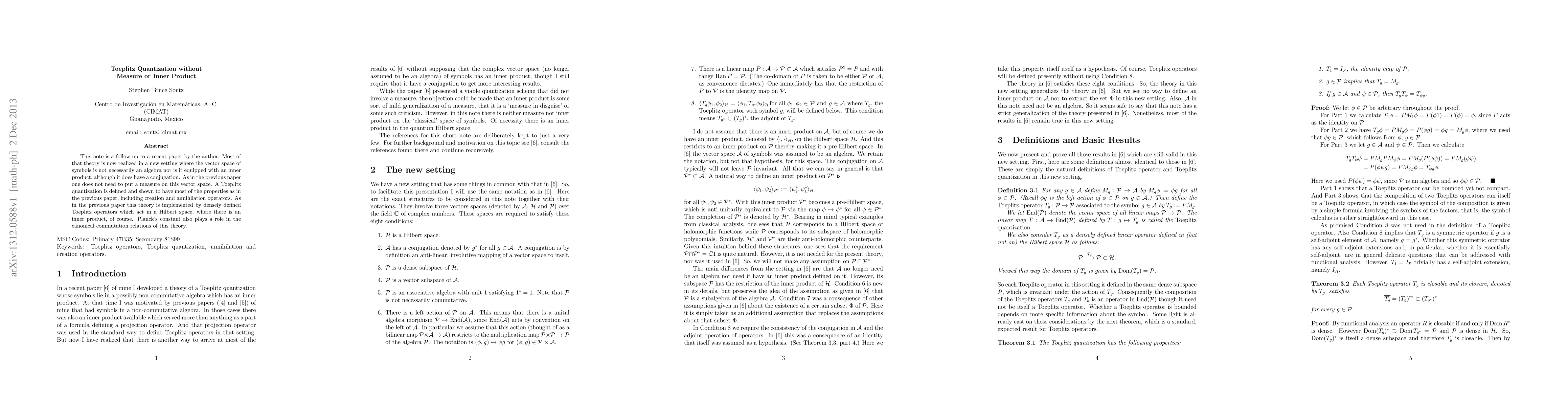 This note is a follow-up to a recent paper by the author. Most of that theory is now realized in a new setting where the vector space of symbols is not necessarily an algebra nor is it equipped with an inner product, although it does have a conjugation. As in the previous paper one does not need to put a measure on this vector space. A Toeplitz quantization is defined and shown to have most of the properties as in the previous paper, including creation and annihilation operators. As in the previous paper this theory is implemented by densely defined Toeplitz operators which act in a Hilbert space, where there is an inner product, of course. Planck's constant also plays a role in the canonical commutation relations of this theory.