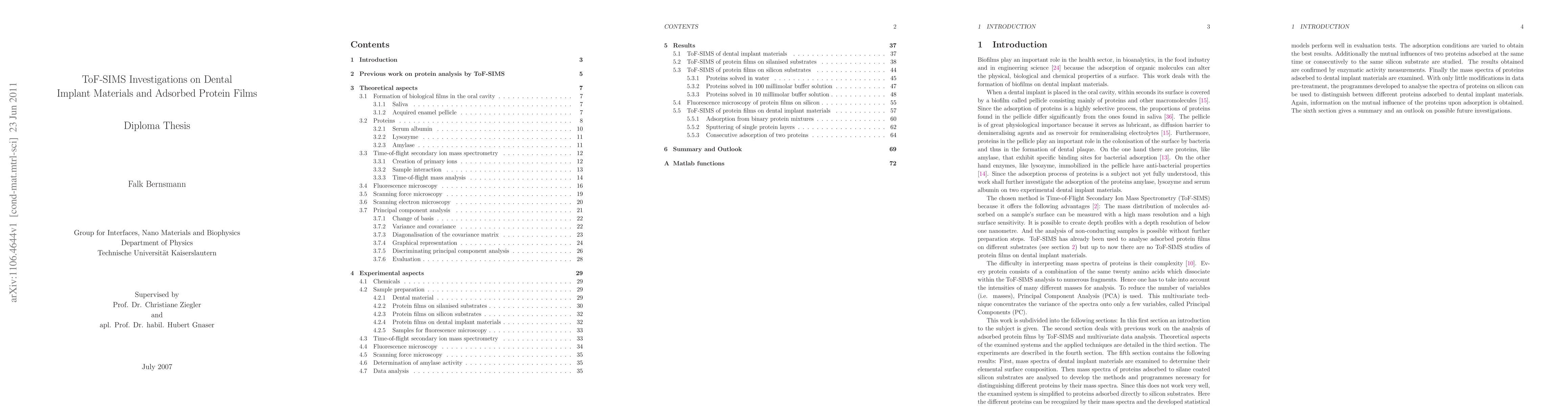 This research investigates dental implant materials (FAT and FAW) and adsorbed protein films (lysozyme, amylase, and BSA) using Time-of-Flight Secondary Ion Mass Spectrometry (ToF-SIMS) and Discriminant Principal Component Analysis (DPCA).