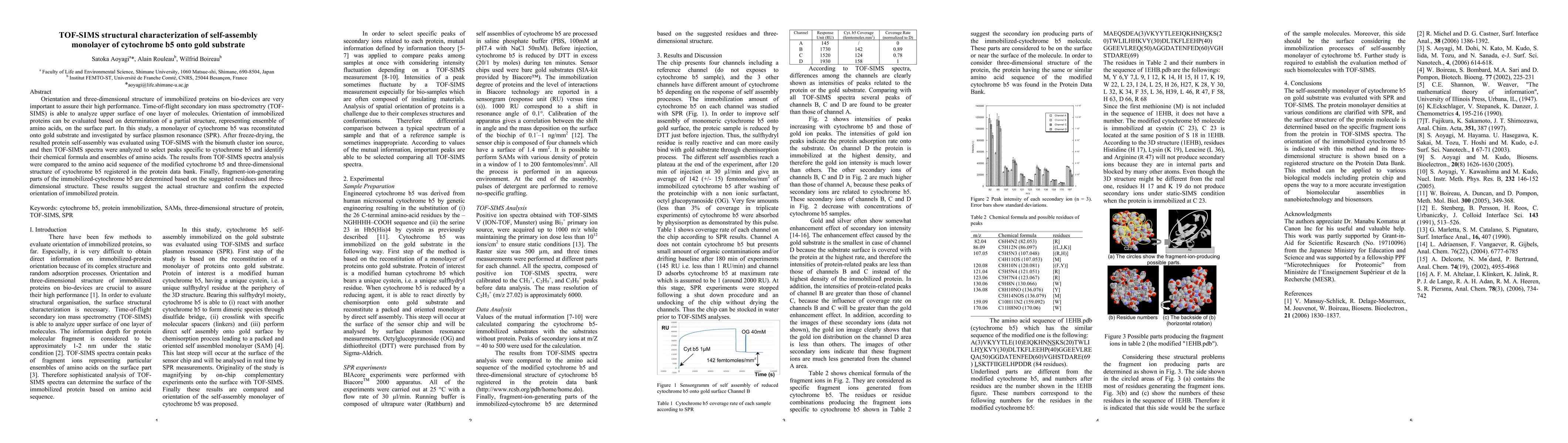 This study uses TOF-SIMS to characterize the self-assembly monolayer of cytochrome b5 on a gold substrate, determining its orientation and three-dimensional structure. The analysis confirms the expected orientation and structural integrity of the immobilized protein based on amino acid sequences and PDB data.