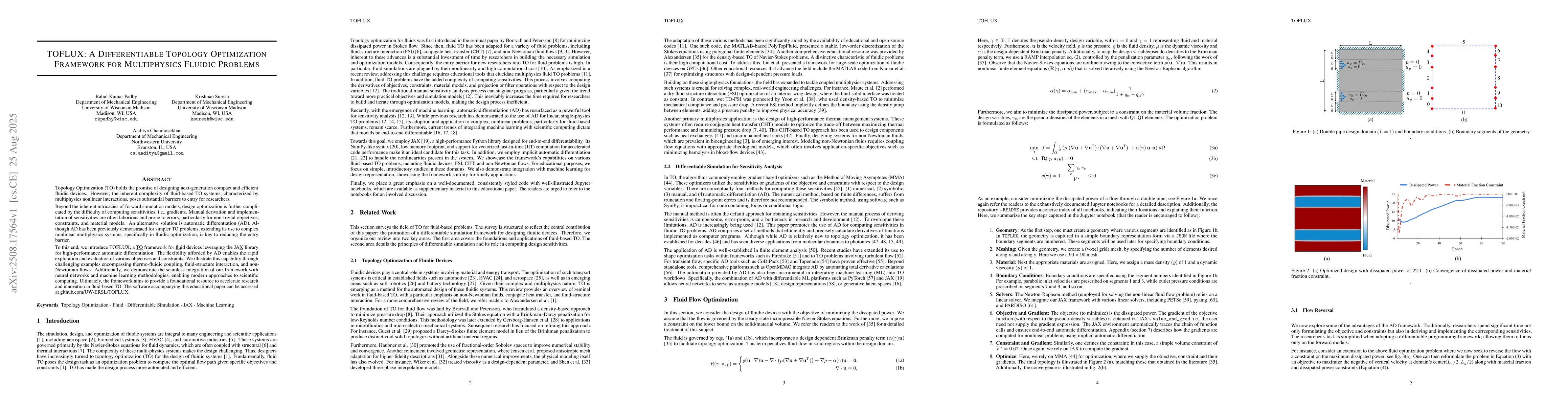 Topology Optimization (TO) holds the promise of designing next-generation compact and efficient fluidic devices. However, the inherent complexity of fluid-based TO systems, characterized by multiphysics nonlinear interactions, poses substantial barriers to entry for researchers. Beyond the inherent intricacies of forward simulation models, design optimization is further complicated by the difficulty of computing sensitivities, i.e., gradients. Manual derivation and implementation of sensitivities are often laborious and prone to errors, particularly for non-trivial objectives, constraints, and material models. An alternative solution is automatic differentiation (AD). Although AD has been previously demonstrated for simpler TO problems, extending its use to complex nonlinear multiphysics systems, specifically in fluidic optimization, is key to reducing the entry barrier. To this end, we introduce TOFLUX, a TO framework for fluid devices leveraging the JAX library for high-performance automatic differentiation. The flexibility afforded by AD enables the rapid exploration and evaluation of various objectives and constraints. We illustrate this capability through challenging examples encompassing thermo-fluidic coupling, fluid-structure interaction, and non-Newtonian flows. Additionally, we demonstrate the seamless integration of our framework with neural networks and machine learning methodologies, enabling modern approaches to scientific computing. Ultimately, the framework aims to provide a foundational resource to accelerate research and innovation in fluid-based TO. The software accompanying this educational paper can be accessed at github.com/UW-ERSL/TOFLUX.