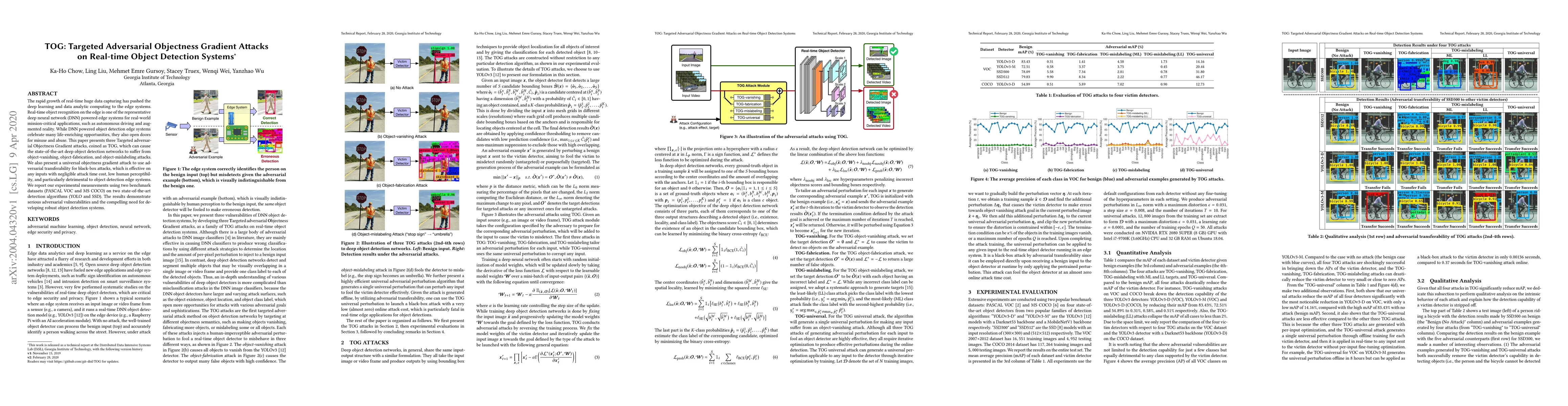 The rapid growth of real-time huge data capturing has pushed the deep learning and data analytic computing to the edge systems. Real-time object recognition on the edge is one of the representative deep neural network (DNN) powered edge systems for real-world mission-critical applications, such as autonomous driving and augmented reality. While DNN powered object detection edge systems celebrate many life-enriching opportunities, they also open doors for misuse and abuse. This paper presents three Targeted adversarial Objectness Gradient attacks, coined as TOG, which can cause the state-of-the-art deep object detection networks to suffer from object-vanishing, object-fabrication, and object-mislabeling attacks. We also present a universal objectness gradient attack to use adversarial transferability for black-box attacks, which is effective on any inputs with negligible attack time cost, low human perceptibility, and particularly detrimental to object detection edge systems. We report our experimental measurements using two benchmark datasets (PASCAL VOC and MS COCO) on two state-of-the-art detection algorithms (YOLO and SSD). The results demonstrate serious adversarial vulnerabilities and the compelling need for developing robust object detection systems.