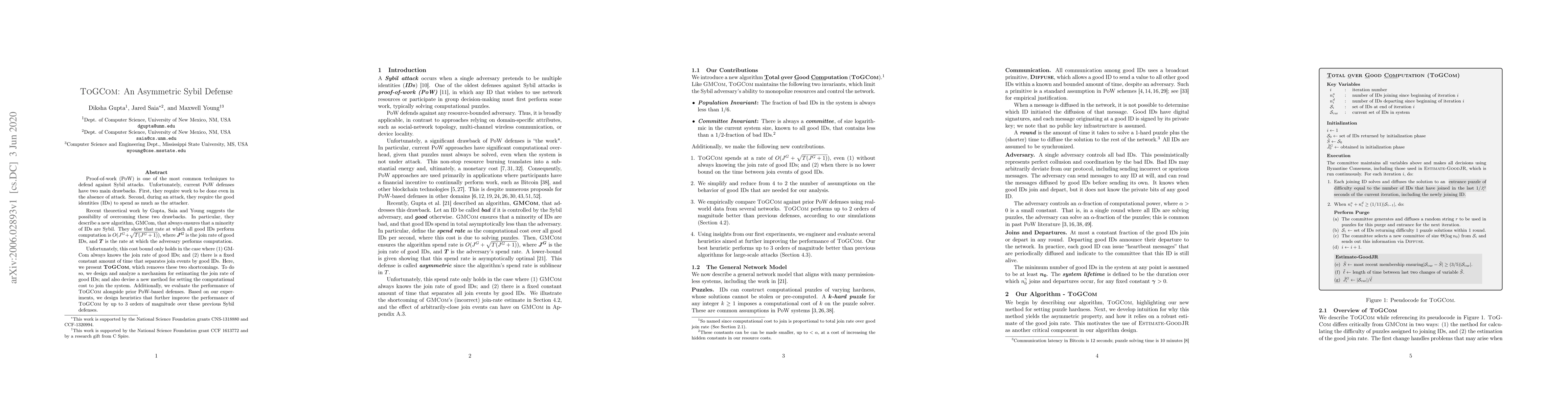 Proof-of-work (PoW) is one of the most common techniques to defend against Sybil attacks. Unfortunately, current PoW defenses have two main drawbacks. First, they require work to be done even in the absence of an attack. Second, during an attack, they require good identities (IDs) to spend as much as the attacker. Recent theoretical work by Gupta, Saia, and Young suggests the possibility of overcoming these two drawbacks. In particular, they describe a new algorithm, GMCom, that always ensures that a minority of IDs are Sybil. They show that rate at which all good IDs perform computation is $O(J_G + \sqrt{T(J_G+1)})$, where $J_G$ is the join rate of good IDs, and $T$ is the rate at which the adversary performs computation. Unfortunately, this cost bound only holds in the case where (1) GMCom always knows the join rate of good IDs; and (2) there is a fixed constant amount of time that separates join events by good IDs. Here, we present ToGCom, which removes these two shortcomings. To do so, we design and analyze a mechanism for estimating the join rate of good IDs; and also devise a new method for setting the computational cost to join the system. Additionally, we evaluate the performance of ToGCom alongside prior PoW-based defenses. Based on our experiments, we design heuristics that further improve the performance of ToGCom by up to $3$ orders of magnitude over these previous Sybil defenses.