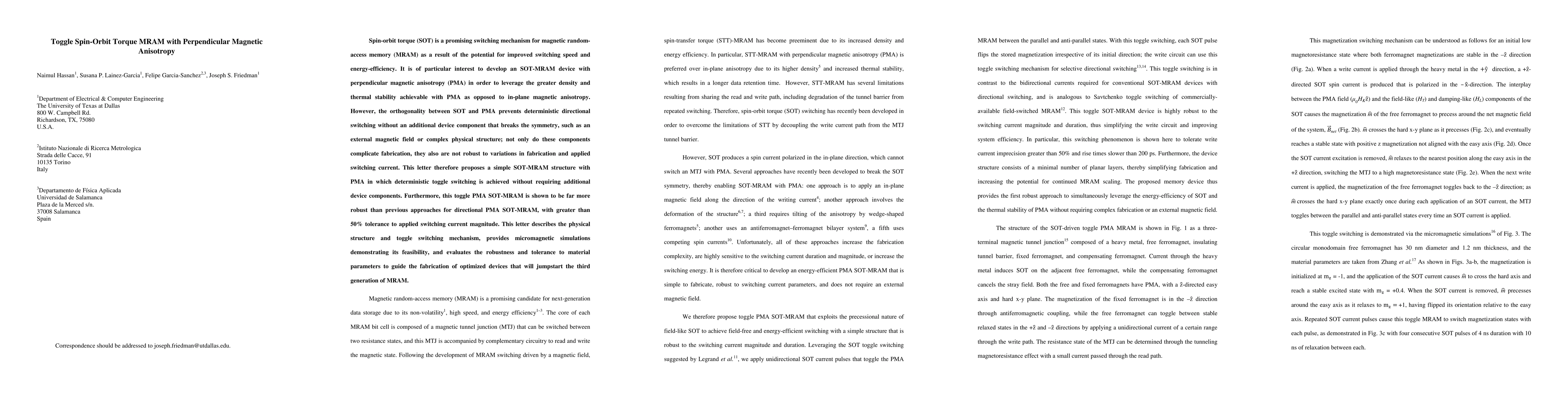 This paper proposes a novel SOT-MRAM structure with perpendicular magnetic anisotropy (PMA) that enables deterministic toggle switching without additional components, offering improved robustness and over 50% tolerance to switching current variations, thus advancing the potential for third-generation MRAM technology.