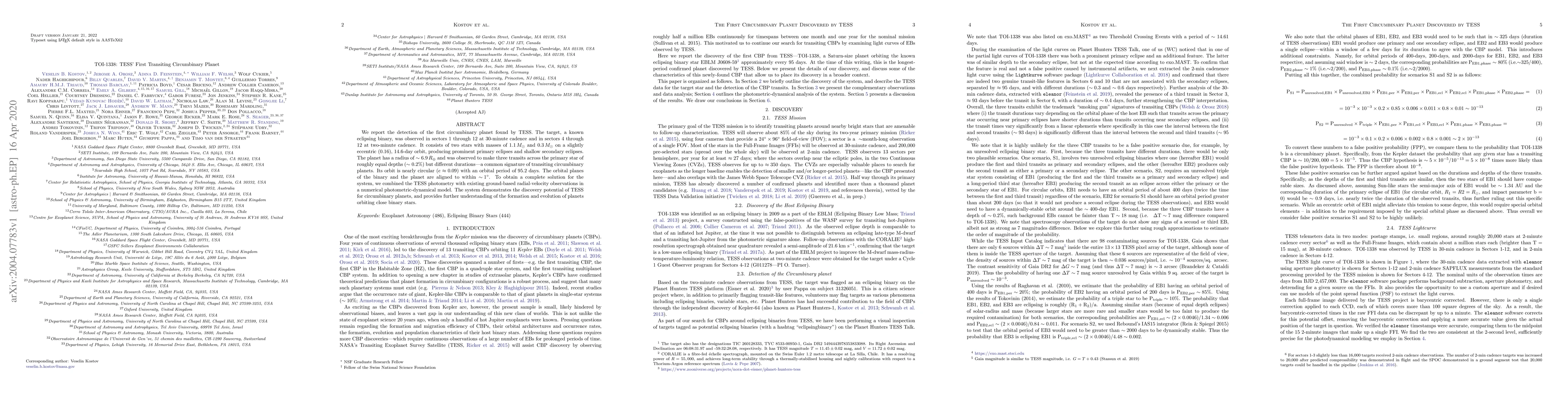 TOI-1338 is the first circumbinary planet discovered by TESS, orbiting a binary star system with an orbital period of 95.2 days. The planet exhibits three transits with similar depths but varying durations, indicating its circumbinary nature.