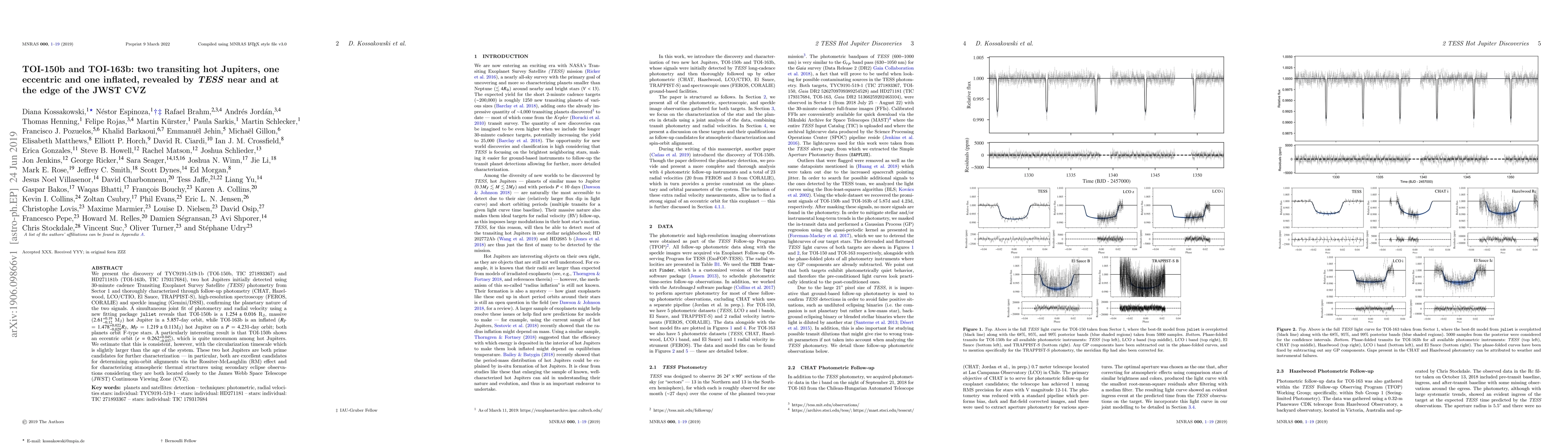 This paper reports the discovery and characterization of two hot Jupiters, TOI-150b and TOI-163b, detected by TESS. TOI-150b is an eccentric hot Jupiter with a 5.857-day orbit, while TOI-163b is an inflated planet with a 4.231-day orbit, both near the JWST CVZ, making them prime targets for further atmospheric studies.