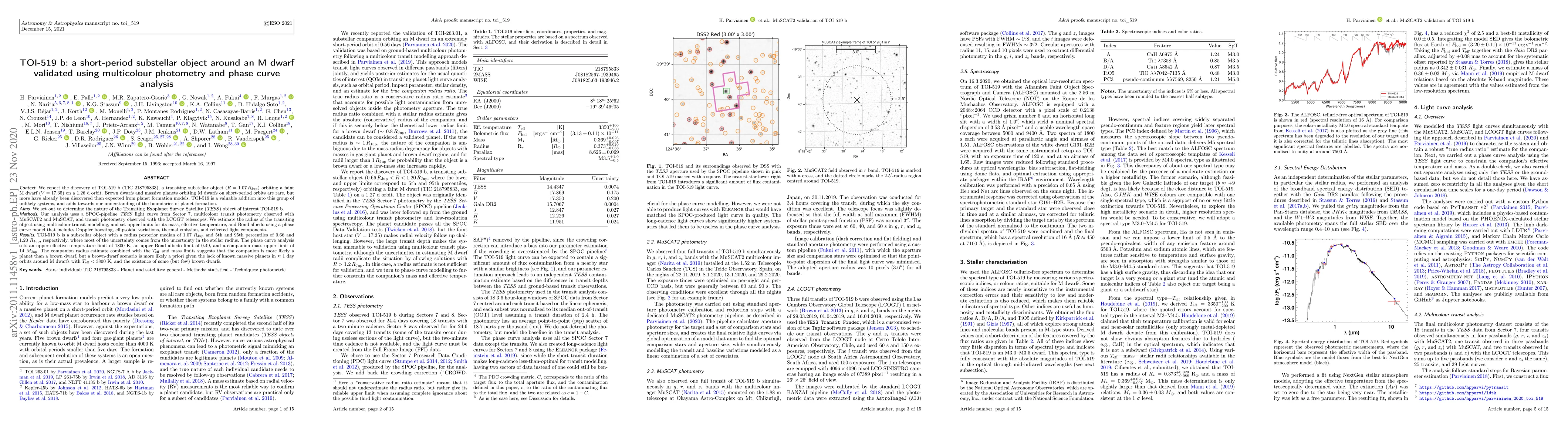TOI-519 b is a transiting substellar object orbiting an M dwarf with a short 1.26-day period, validated using multicolour photometry and phase curve analysis. The object's radius is estimated at 1.07 RJup, with upper limits on its mass, effective temperature, and Bond albedo suggesting it is more likely a planet than a brown dwarf.
