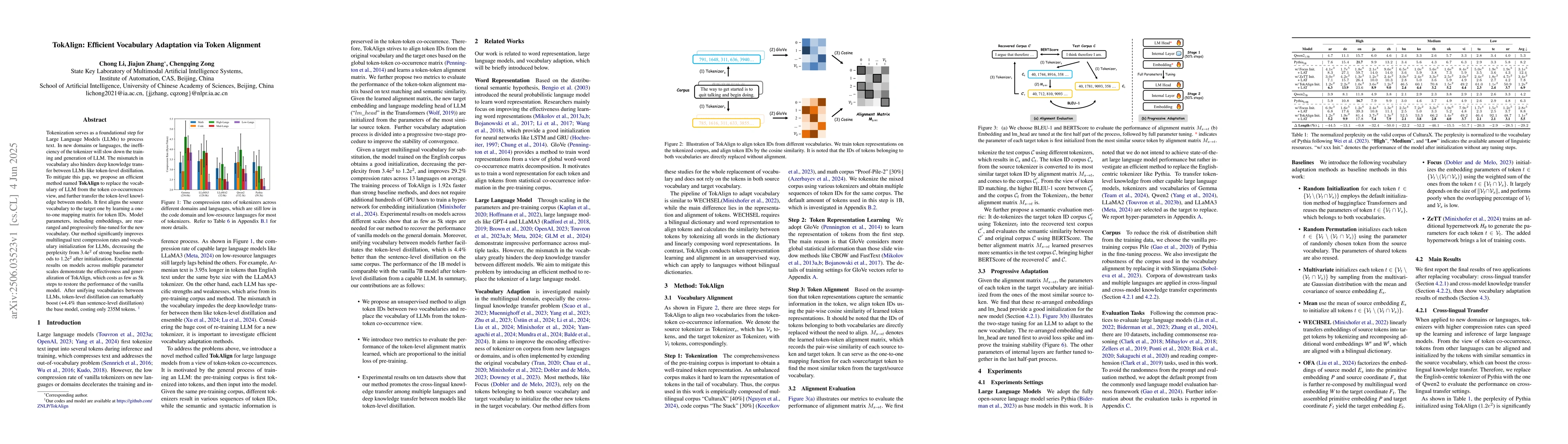 TokAlign improves Large Language Models by adapting vocabulary through token alignment, significantly reducing perplexity and increasing text compression rates.