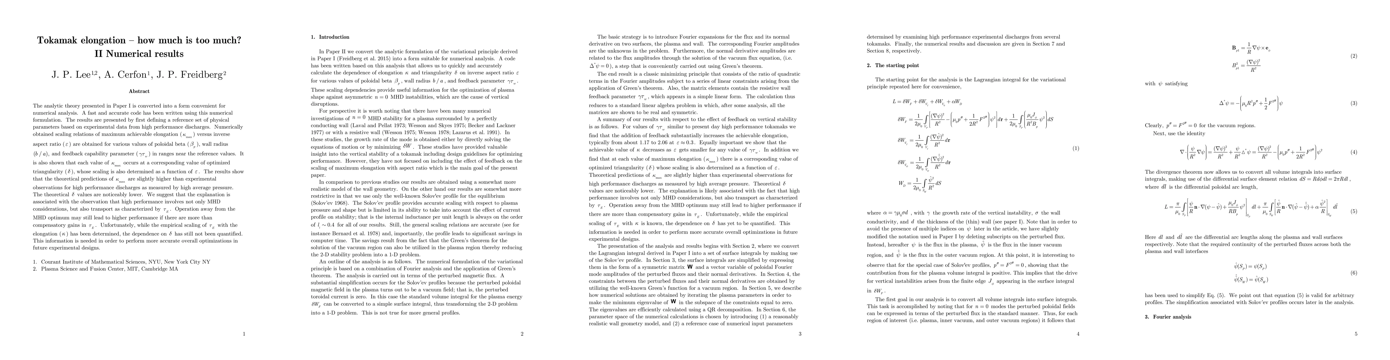 The analytic theory presented in Paper I is converted into a form convenient for numerical analysis. A fast and accurate code has been written using this numerical formulation. The results are presented by first defining a reference set of physical parameters based on experimental data from high performance discharges. Numerically obtained scaling relations of maximum achievable elongation versus inverse aspect ratio are obtained for various values of poloidal beta, wall radius and feedback capability parameter in ranges near the reference values. It is also shown that each value of maximum elongation occurs at a corresponding value of optimized triangularity, whose scaling is also determined as a function of inverse aspect ratio. The results show that the theoretical predictions of maximum elongation are slightly higher than experimental observations for high performance discharges as measured by high average pressure. The theoretical optimized triangularity values are noticeably lower. We suggest that the explanation is associated with the observation that high performance involves not only MHD considerations, but also transport as characterized by confinement time. Operation away from the MHD optimum may still lead to higher performance if there are more than compensatory gains in the confinement time. Unfortunately, while the empirical scaling of the confinement time with the elongation has been determined, the dependence on the triangularity has still not been quantified. This information is needed in order to perform more accurate overall optimizations in future experimental designs.