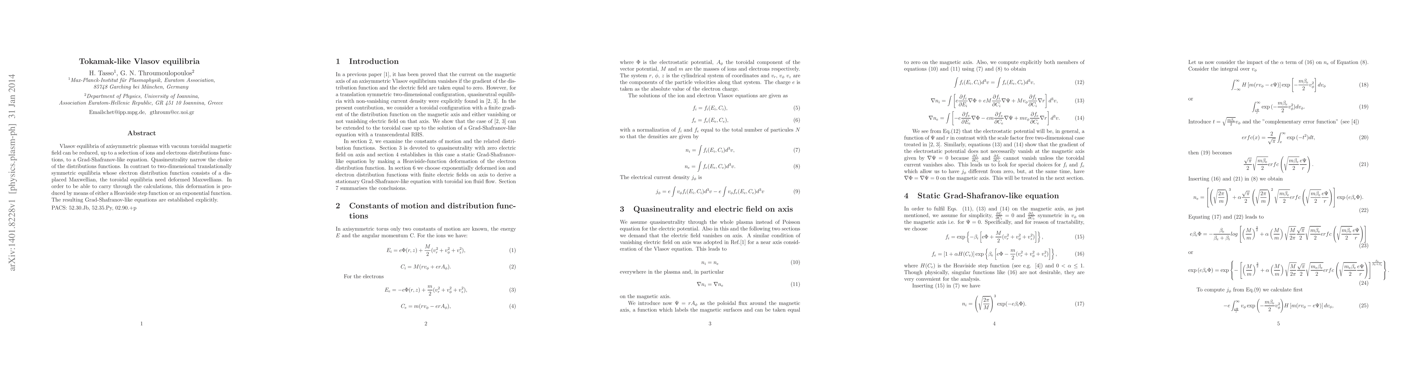 Vlasov equilibria of axisymmetric plasmas with vacuum toroidal magnetic field can be reduced, up to a selection of ions and electrons distributions functions, to a Grad-Shafranov-like equation. Quasineutrality narrow the choice of the distributions functions. In contrast to two-dimensional translationally symmetric equilibria whose electron distribution function consists of a displaced Maxwellian, the toroidal equilibria need deformed Maxwellians. In order to be able to carry through the calculations, this deformation is produced by means of either a Heaviside step function or an exponential function. The resulting Grad-Shafranov-like equations are established explicitly.