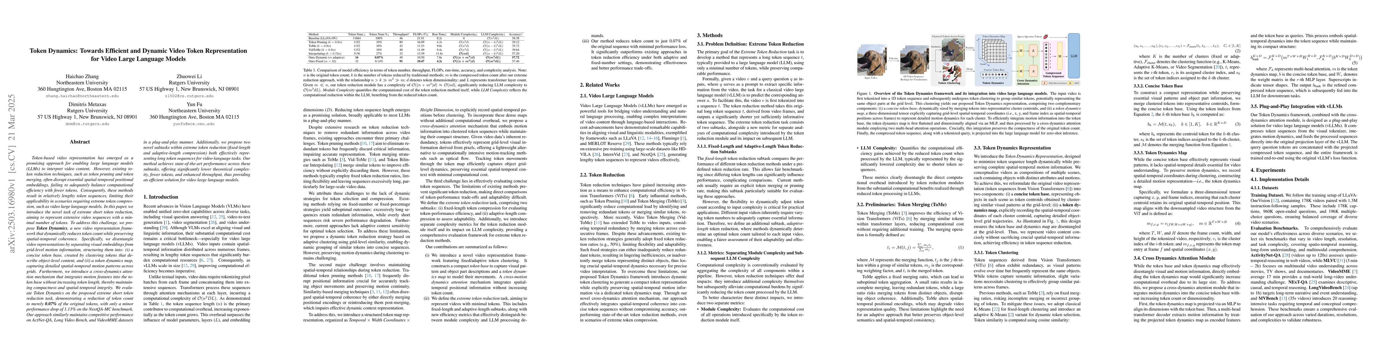 This paper introduces Token Dynamics, a framework for efficient and dynamic video token representation aimed at extreme token reduction for video large language models. It proposes a method that disentangles visual embeddings from motion information and employs a cross-dynamics attention mechanism to maintain spatial-temporal coherence while significantly reducing token count with minimal performance loss.